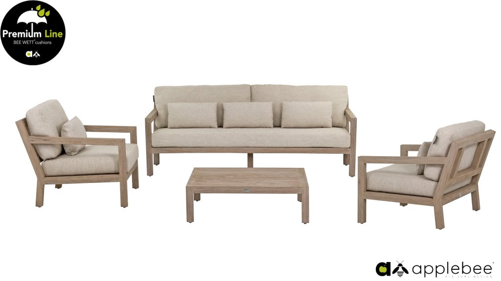 Die klaren, kantigen Linien dieses Applebee Olive Lounge-Sets sind schräg. Schieben Sie die Ottomane in den Loungesessel und genießen Sie den Komfort, den dieses Teakholz-Set zu bieten hat. Auf unseren weichen und wetterfesten Bee Wett®-Kissen werden Sie sich garantiert wohlfühlen!