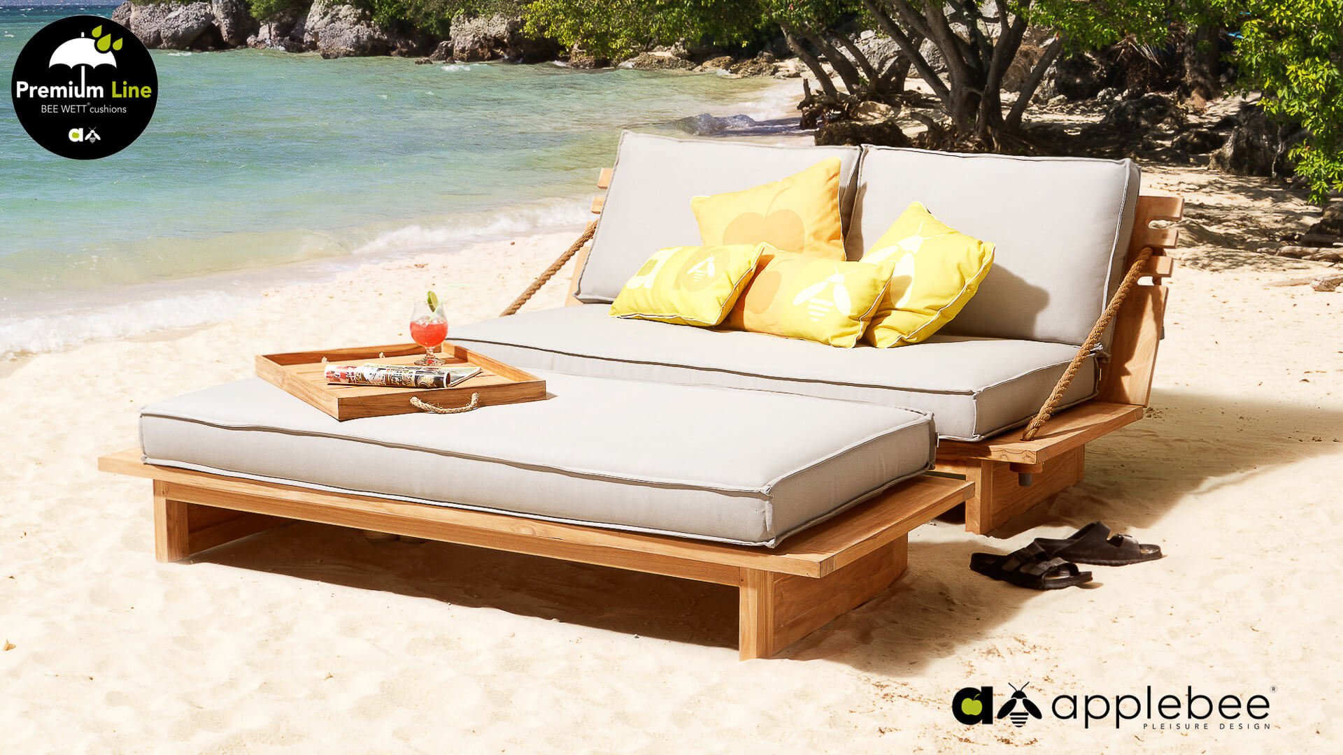 AppleBee BEE WETT sind spezielle wetterfeste Kissen die natürlich draussen liegen bleiben können. Die abnehmbaren Hüllen werden aus den bestenmöglichen Stoffen hergestellt und sind alle waschbar auf 30°. Der Stoff ist zusätzlich wasserabstoßend und garantiert UV-beständig. Eine offenes Gewebe an der Unterseite der Kissen sorgt für eine perfekte Drainage. Der Vorteil, dass die BEE WETT Kissen und Polster unglaublich viel schneller trocknen als vergleichbare andere Kissen. Das Stoff hat eine gute Beständigkeit gegen Verfaulen und Stockflecken und darüber hinaus UV-beständig, weich, komfortabel und feuchtigkeitsabstoßend ist. Die Polster sind ausziehbar und waschbar.