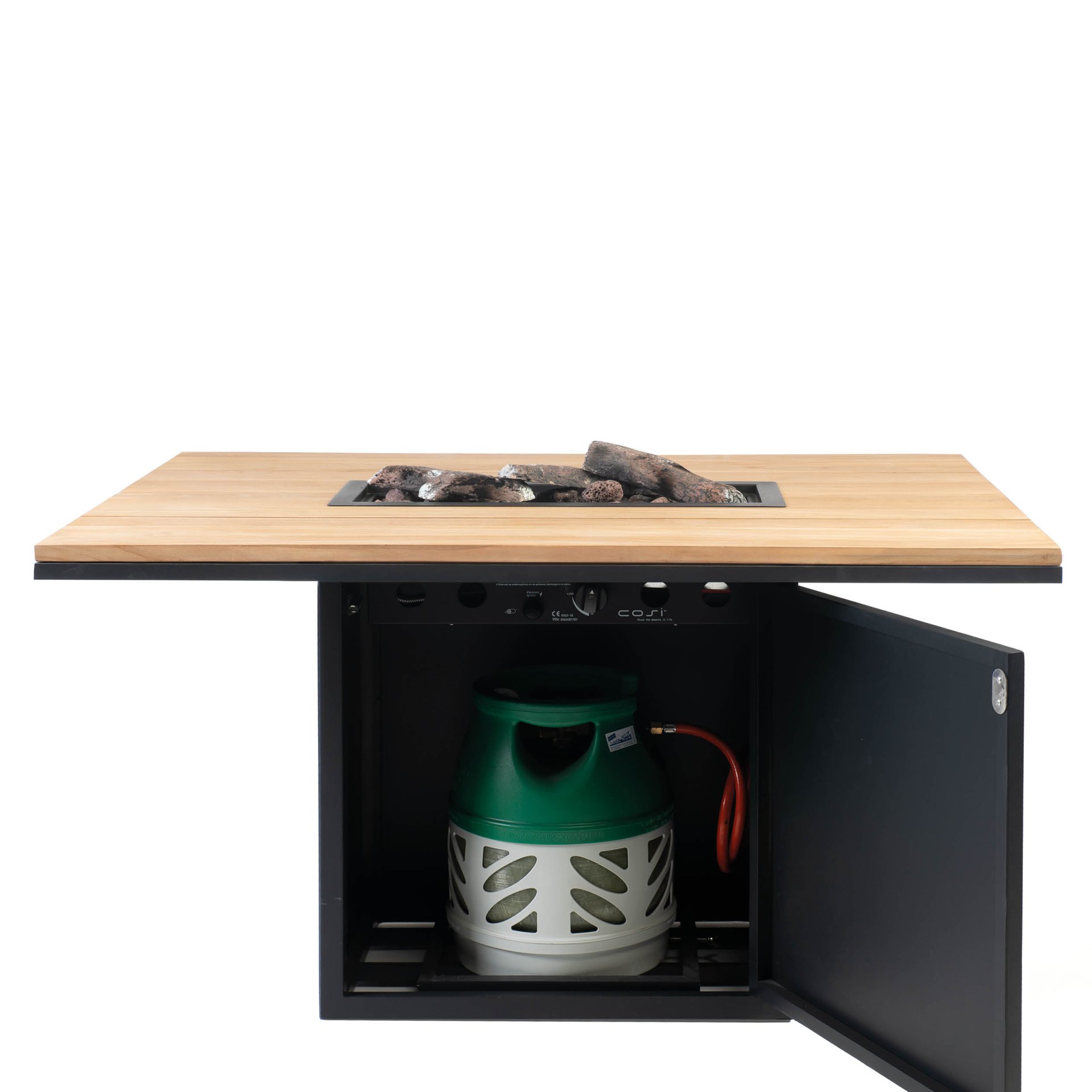 Der Cosiloft 120 Lounge-Tisch kann problemlos mit einer Vielzahl von Lounge-Sets kombiniert werden. Der Cosiloft 120 Lounge-Tisch verfügt über einen geraden Brenner, der genügend Platz bietet, um alle Ihre Freunde und Familie zu einem Drink einzuladen. Der Cosiloft ist 80 cm breit und 120 cm lang. Genau wie der Cosiloft 100 verfügt dieser Feuertisch über einen schönen, durchbrochenen Aluminiumrahmen, der mit einer der drei Tischplatten kombiniert werden kann: Teak, Schwarz und Grau. Der Rahmen ist in zwei Farben erhältlich: Weiß für einen modernen Look oder Schwarz für einen industriellen Stil. Trotz seiner schönen Lounge-Tischhöhe passt der Cosiloft 120 sogar in eine 5-kg-Gasflasche. Dies passt gut zum reinen Design des Cosiloft-Tisches. Eine Abdeckplatte für den Brenner liegt jedem Cosiloft bei. Wenn Sie das Feuer nicht eingeschaltet haben, können Sie die gesamte Tischfläche auf diese Weise verwenden.