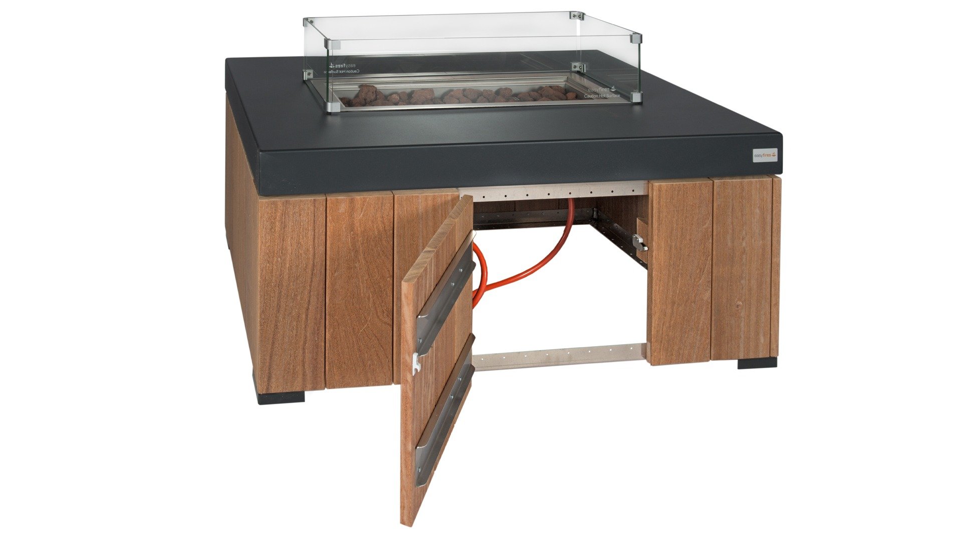 Die Easyfires-Tische sind größtenteils aus Cumaru-Hartholz gefertigt, das Gestell besteht aus Aluminium. Sie können die Gasflasche in den Easyfires-Feuertischen aufbewahren. Der Gaskamin lässt sich einfach mit einer elektrischen Zündung entzünden. Die Höhe der Flamme lässt sich über einen Drehknopf einstellen.