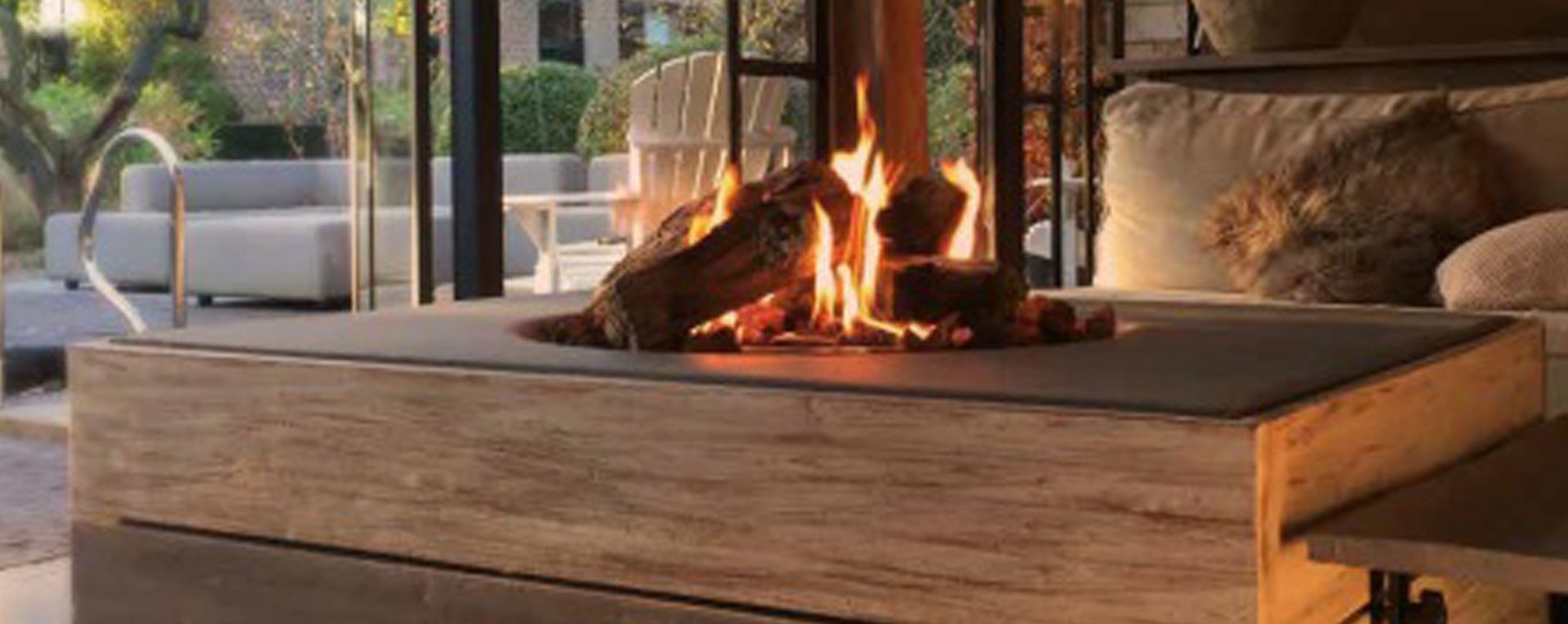 Feuertische inkl. Abdeckung, Holzscheite, Lavasteine und Gasleitung (2,5m).