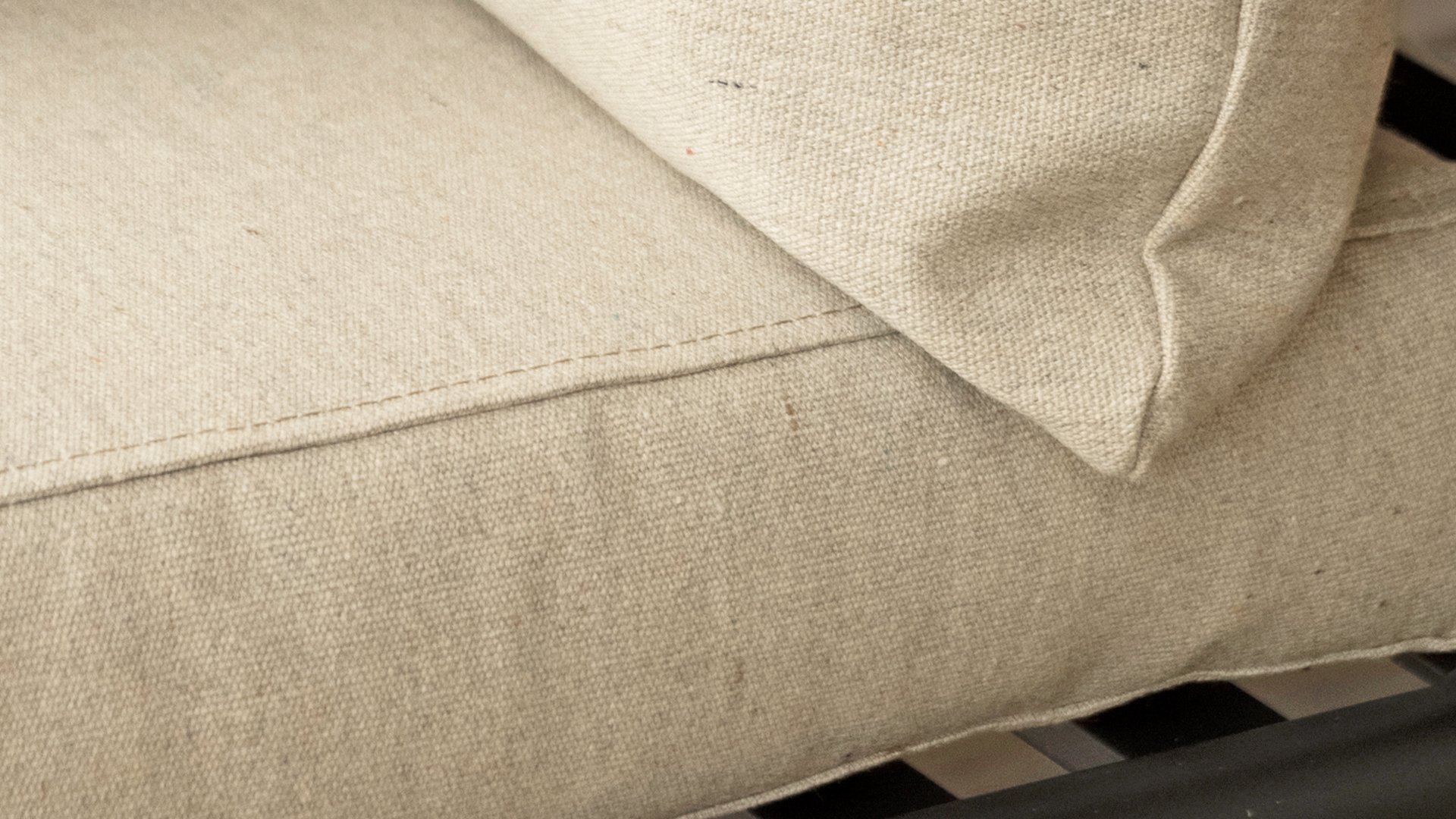 Wasser fließt direkt durch den speziellen Schaum hindurch, während ein weiteres Material, Dacron, dafür sorgt, dass die Kissen ihre originale Form behalten. Die Polster sind ausziehbar und waschbar. Die Kissen HOUE AVON bestehen aus Sunbrella Heritage-Stoff, der zu 50 % aus recyceltem Acryl besteht. Bunte Faserenden aus dem Prozess der Wiederverwendung des Primärmaterials können im Gewebe erscheinen und die Stofffarbe von einer Charge zur anderen variieren. So entsteht ein einzigartiger Stoff mit natürlichem Look und Vintage-Charme. Der Stoff ist Oeko-Tex-zertifiziert, wasserabweisend, schmutzabweisend und pflegeleicht.
