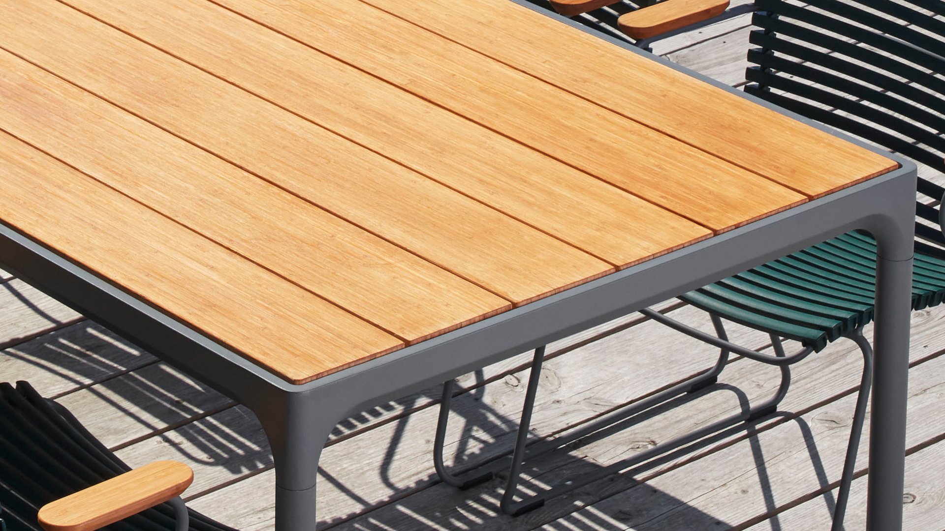 Der Four Tisch von Houe ist ein robustes Modell, das gut in ein industrielles Interieur oder ein cooles Interieur passt. Der Tisch ist so konzipiert, dass er Wind und Wetter standhält. Der Tisch Four hat einen stabilen Aluminiumrahmen, der in grau oder schwarz pulverbeschichtet erhältlich ist. Die Bambus-Tischplatte hat eine Struktur, die sich sehr gut für den Außenbereich eignet. Der Tisch kommt in den Maßen mit einer Länge von 90, 160, 210 und 270 cm und hat alle eine Breite von 90 cm und eine Höhe von 74 cm (Stehtisch 111 cm hoch). Bambus ist eine nachhaltigere Alternative zu Teak. Wir empfehlen, den Bambus 2-3 mal im Jahr zu ölen, dann behält der Tisch länger seine warmen Farben.
