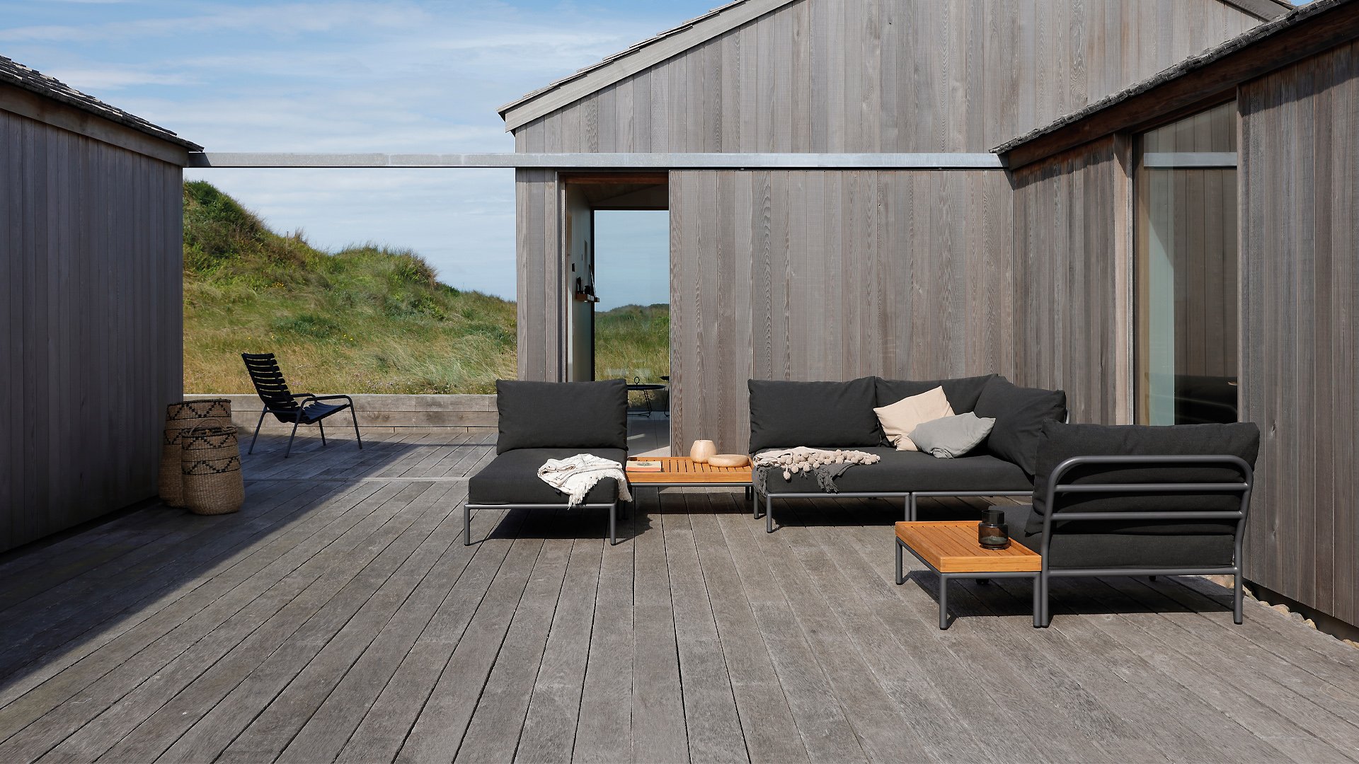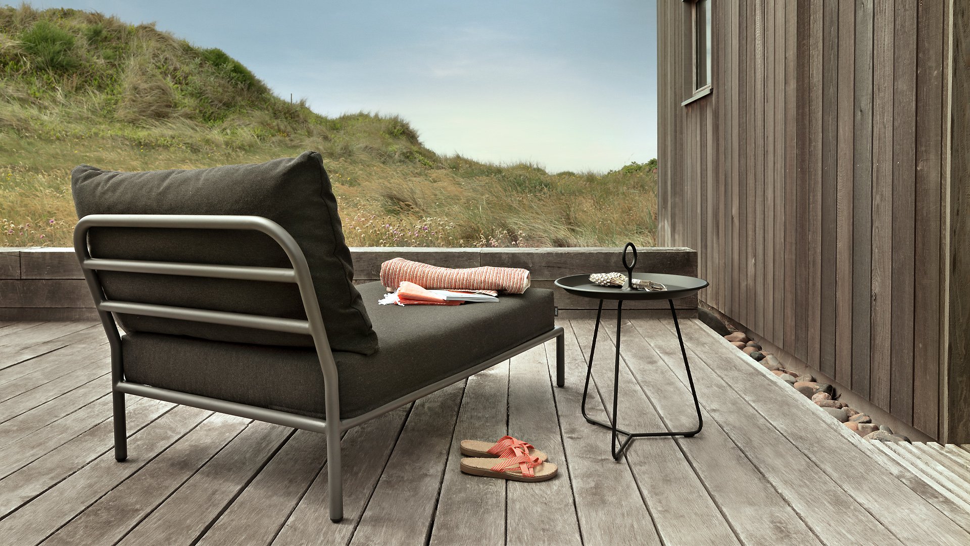 Die Houe Level2 Lounge-Serie hat ein neues Design und eine weichere Füllung der Rückenkissen für ein entspannteres Lounge-Erlebnis, ebenfalls entworfen von Henrik Pedersen.Es geht um Ebene, sich der Natur zu stellen, sich auf den Horizont zu beziehen und Linien und Formen auf die nächste Ebene zu bringen! Der leichte Rahmen und die weichen Kissen schaffen sowohl Kontrast als auch Komfort - und locken mit einer entspannten Lounge-Atmosphäre. HOUE LEVEL ist eine Lounge-Serie, die aus 2 Sofamodulen besteht - einem links und einem rechts - einem einzelnen Stuhl, einer Ottomane, einem Couchtisch und einem Beistelltisch, wodurch die Module auf viele verschiedene Arten kombiniert werden können. Die Kissen in Alpengrün und Esche in Hellgrau / Ecru-Farbe und Char Farbe bestehen aus Sunbrella Heritage-Material, das zu 50% aus recyceltem Acryl besteht.
