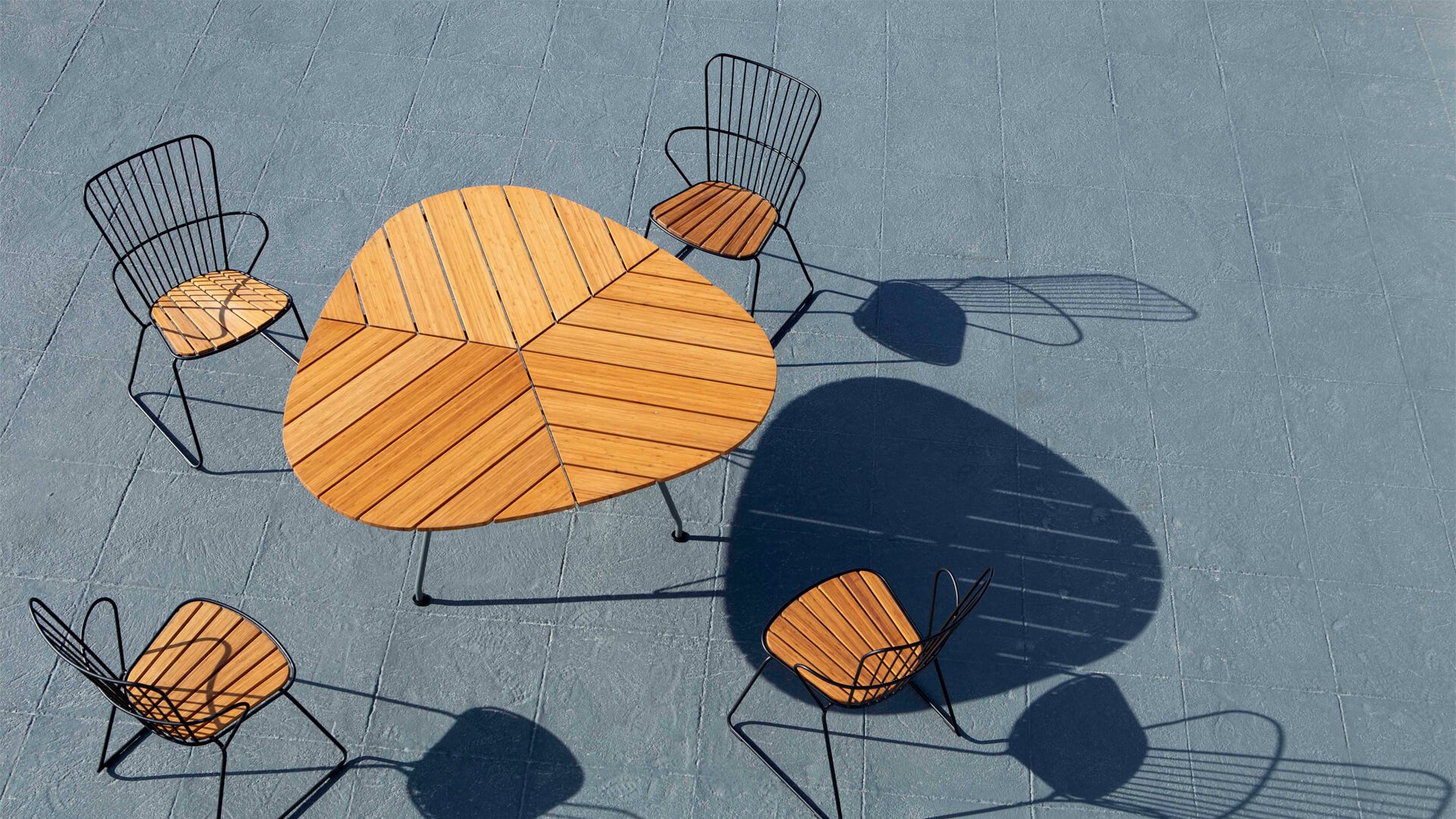Dieser einzigartige Tisch von Houe hat seinen Namen nicht gestohlen, die Ähnlichkeit mit einem Blatt ist frappierend... Durch die dreieckige Form und die Platzierung des Fußes können bis zu 9 Personen im Leaf speisen. Der von Henrik Pedersen entworfene Tisch Leaf besteht aus grau pulverbeschichtetem Metall mit einer Tischplatte aus Bambuslatten. Bambus ist eine schnell wachsende Pflanze. Vorausgesetzt, es wird richtig gepflegt, ist es ein haltbareres Material als Teak. Wir empfehlen Bambus 2-3 mal im Jahr zu ölen, dann hält der Tisch sehr lange und behält seine warmen Farben.