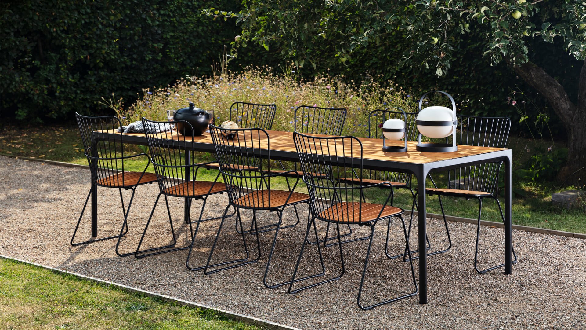 Der Four Tisch von Houe ist ein robustes Modell, das gut in ein industrielles Interieur oder ein cooles Interieur passt. Der Tisch ist so konzipiert, dass er Wind und Wetter standhält. Der Tisch Four hat einen stabilen Aluminiumrahmen, der in grau oder schwarz pulverbeschichtet erhältlich ist. Die Bambus-Tischplatte hat eine Struktur, die sich sehr gut für den Außenbereich eignet. Der Tisch kommt in den Maßen mit einer Länge von 90, 160, 210 und 270 cm und hat alle eine Breite von 90 cm und eine Höhe von 74 cm (Stehtisch 111 cm hoch). Bambus ist eine nachhaltigere Alternative zu Teak. Wir empfehlen, den Bambus 2-3 mal im Jahr zu ölen, dann behält der Tisch länger seine warmen Farben.