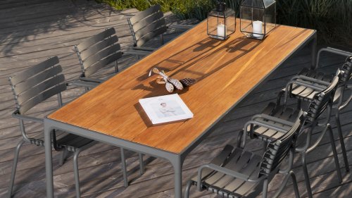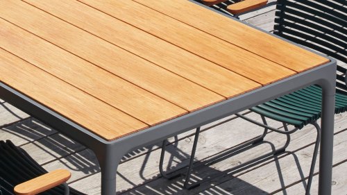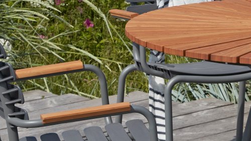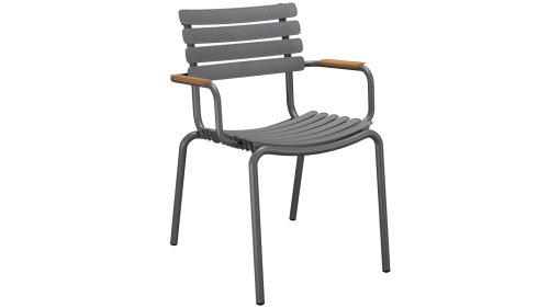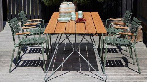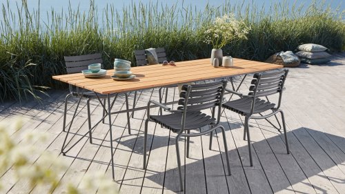 Die Komponenten der großen Lamellen wurden sorgfältig zusammengebaut, um genau die richtige Festigkeit und Elastizität zu gewährleisten. Das Aluminium in Kombination mit dem UV-geschützten Kunststoff reduziert die Wartung auf ein Minimum. THE HOUE ReClips wurde mit Blick auf Komfort entwickelt und so geformt, dass Sie einen hervorragenden, kissenfreien Komfort erhalten, sodass Sie sich stundenlang entspannen können. Ein stilvoller Stuhl mit nachhaltigem Charakter. So lässt sich der ReClips Gartenstuhl mit Bambusarmlehnen der dänischen Marke HOUE am besten beschreiben. Die breiten Lamellen von ReClips werden aus Kunststoffabfällen hergestellt und in Dänemark hergestellt. Dies bedeutet, dass nicht nur Material wiederverwendet wird, sondern auch während des Produktionsprozesses eine erhebliche Menge an Energie eingespart wird. ReClips ist nicht nur nachhaltig, sondern auch eine Augenweide.
