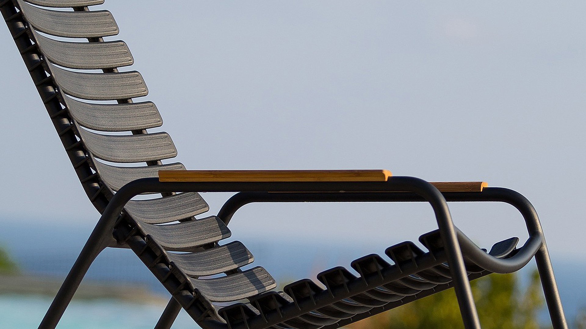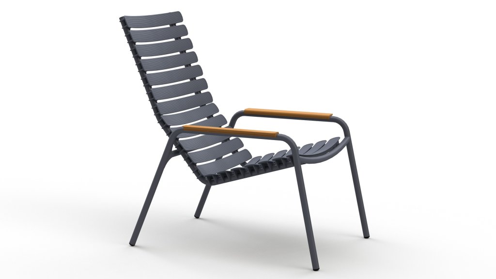 Die HOUE Reclips-Serie besteht aus recyceltem Kunststoff. In Kombination mit dem pulverbeschichteten Aluminiumrahmen ist dies ein wartungsfreier Loungesessel. Durch die ergonomisch geformte Rückenlehne ist der Stuhl auch ohne Kissen sehr bequem zu benutzen. Ein Barstuhl, ein Gartenstuhl und ein Schaukelstuhl sind ebenfalls in dieser Serie erhältlich. Jeder Stuhl ist mit einer Armlehne aus Aluminium oder Bambus erhältlich.