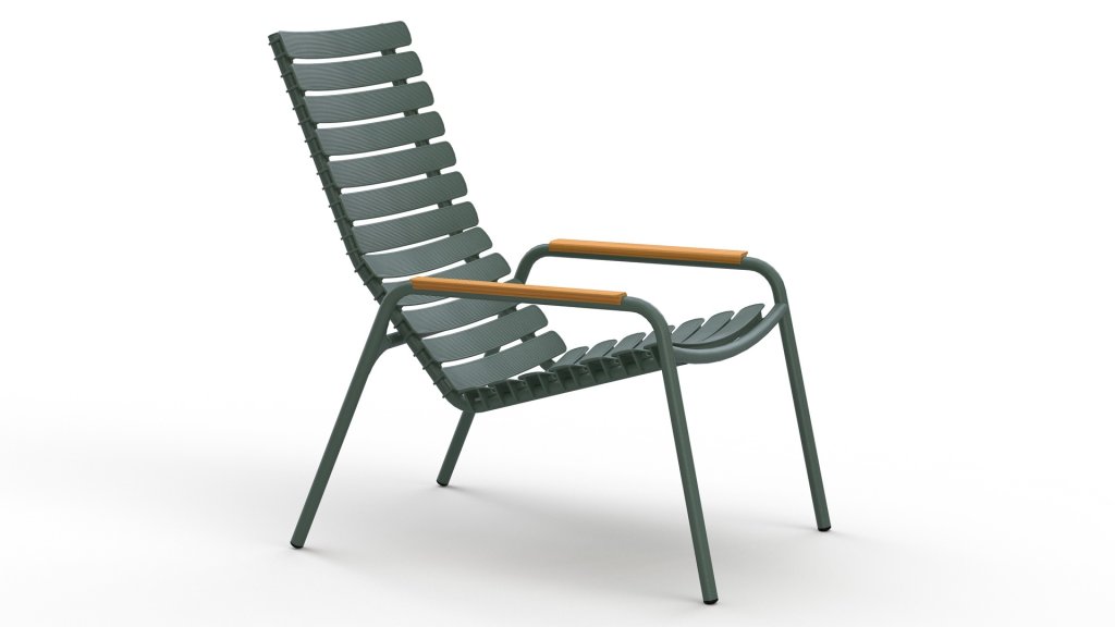 Die HOUE Reclips-Serie besteht aus recyceltem Kunststoff. In Kombination mit dem pulverbeschichteten Aluminiumrahmen ist dies ein wartungsfreier Loungesessel. Durch die ergonomisch geformte Rückenlehne ist der Stuhl auch ohne Kissen sehr bequem zu benutzen. Ein Barstuhl, ein Gartenstuhl und ein Schaukelstuhl sind ebenfalls in dieser Serie erhältlich. Jeder Stuhl ist mit einer Armlehne aus Aluminium oder Bambus erhältlich.