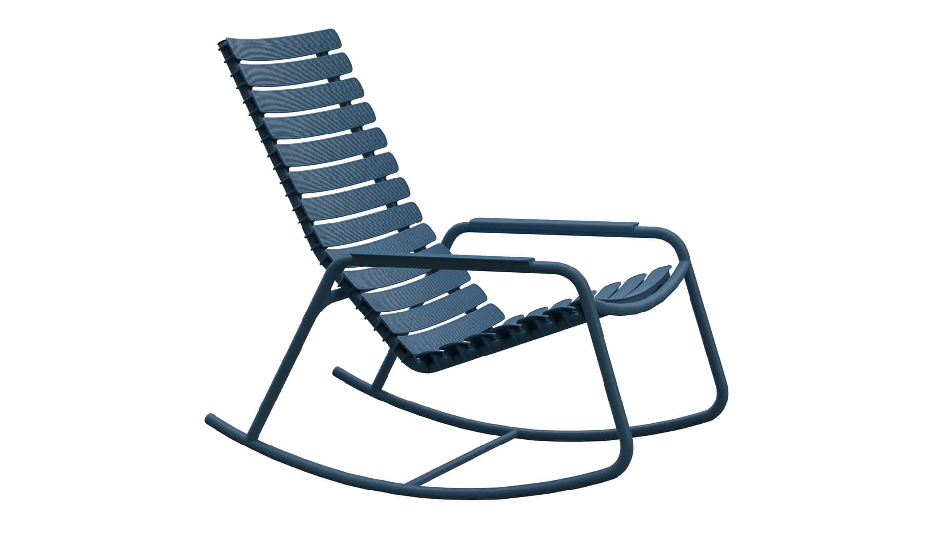 Der HOUE ReClips Schaukelstuhl ist zum Entspannen gemacht. Der Stuhl besteht aus einem pulverbeschichteten Aluminiumgestell mit Kunststofflatten. Die Lamellen werden aus recyceltem Hausmüll hergestellt. Aufgrund ihrer ergonomischen Form bietet die Serie auch ohne Kissen einen hervorragenden Sitzkomfort. Die gesamte ReClips-Serie besteht aus einem Gartenstuhl, einem Loungesessel und einem Schaukelstuhl.