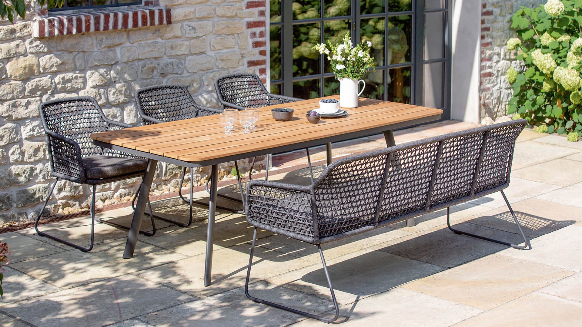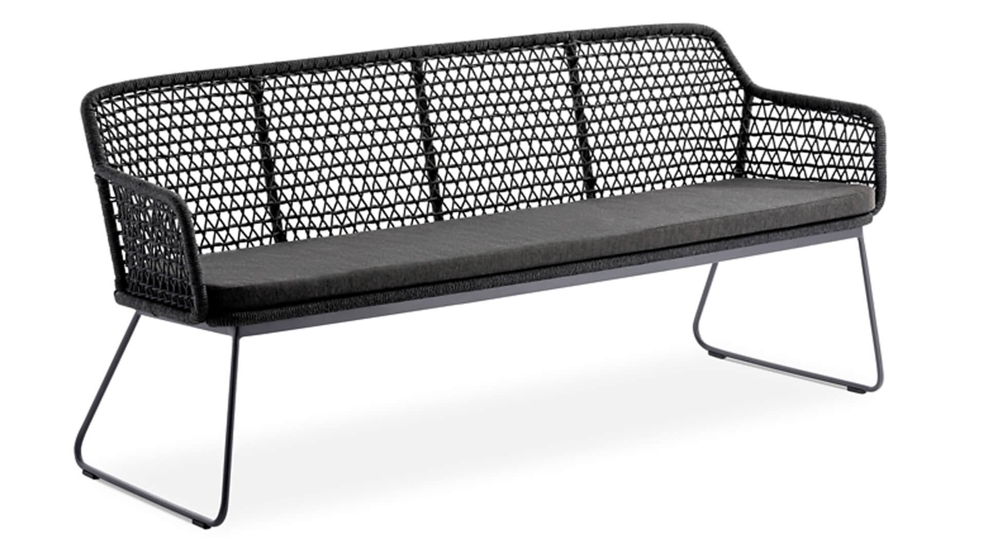 Eine moderne Sitzbank ist der Niehoff KUBU Bank. Der abgerundete Aluminiumrahmen der Rücken- und Armlehne ist mit ansprechender Kordelflechtung in Rautenoptik bezogen.
