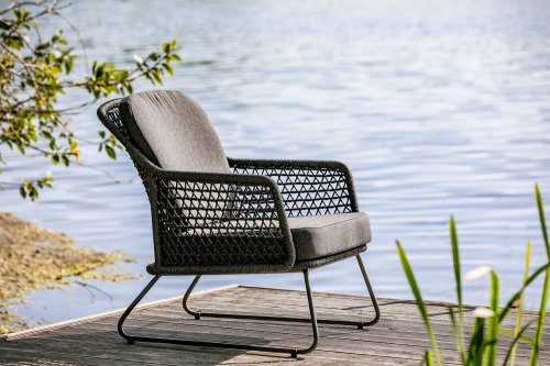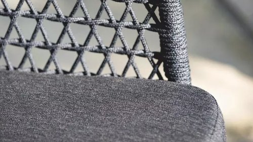 Das Niehoff Kubu Gestell ist mit Kunststoffgeflecht in Form von Seilen (Rope) geflochten. Die Kissen sind aus einem wunderschönen Stoff in Southend Anthrazit. Die Widerstandsfähigkeit des Rope-Materials und die wunderbaren Sitz- und Rückenkissen schaffen einen großartigen Sitzkomfort! Dieser Stoff ist sehr witterungsbeständig und strapazierfähig.