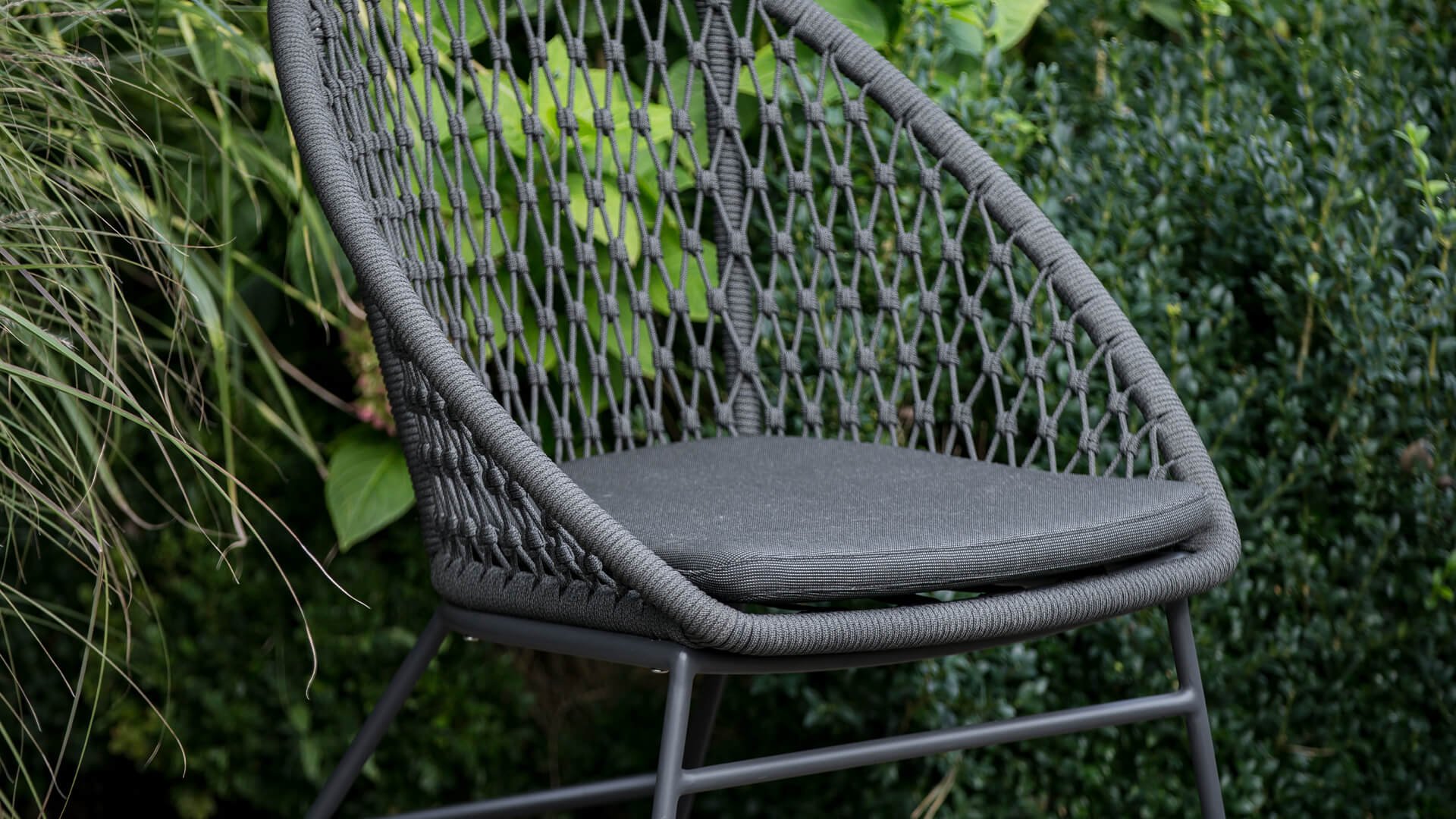 Für die Kordelbespannung von Stühlen, Loungesesseln und Barhockern verwenden wir eine hochwertige, witterungsbeständige Kordel aus Polypropylen. Die durchgefärbte Kunststoffkordel ist wasserabweisend, UV-beständig, reißfest und äußerst formstabil. Selbst Fett dringt nicht tiefer ins Material ein und kann problemlos entfernt werden. Dank dieser Eigenschaften eignet sich Kordelflechtung hervorragend für die Verwendung im Außenbereich. Das geflochtene Material verleiht den Möbelstücken eine organische Textur und schafft damit eine Verbindung von Möbel und Natur.