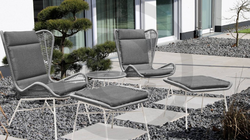 | Materialien Loungegruppe | Pulverbeschichtet Aluminium/Stahl, Rope |