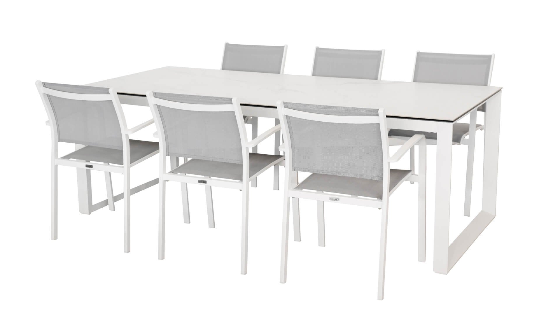 Der Taste by 4 Seasons Outdoor Heritage Table 220cm White Ceramic ist ein hochwertiger Tisch. Das Industriedesign mit seinem eleganten Kufenbein lässt sich gut mit einem weißen Esszimmerstuhl kombinieren. Der Aluminiumrahmen ist pulverbeschichtet und rostet nicht. Die Keramik ist wartungsfrei und verleiht Ihrer Essgruppe ein elegantes Aussehen. Die Keramik hat die Marmoroptik.