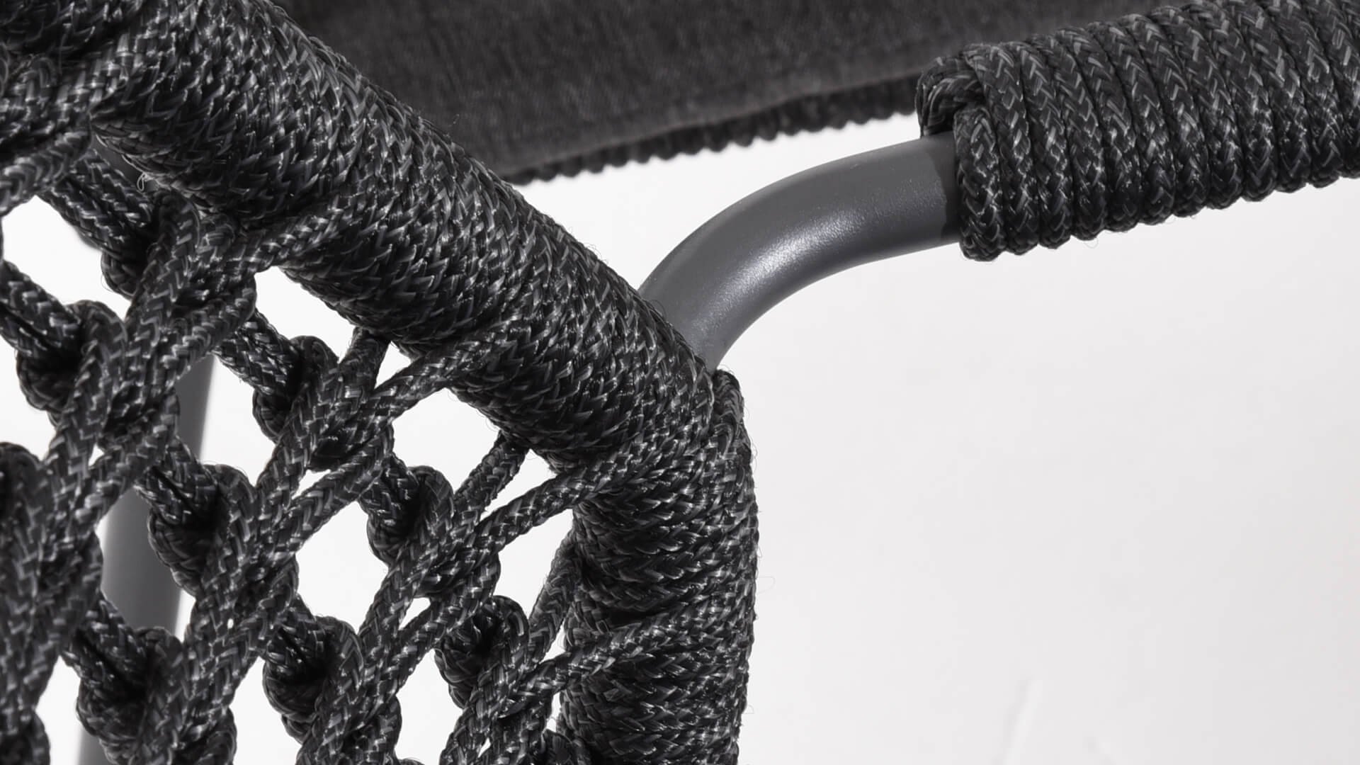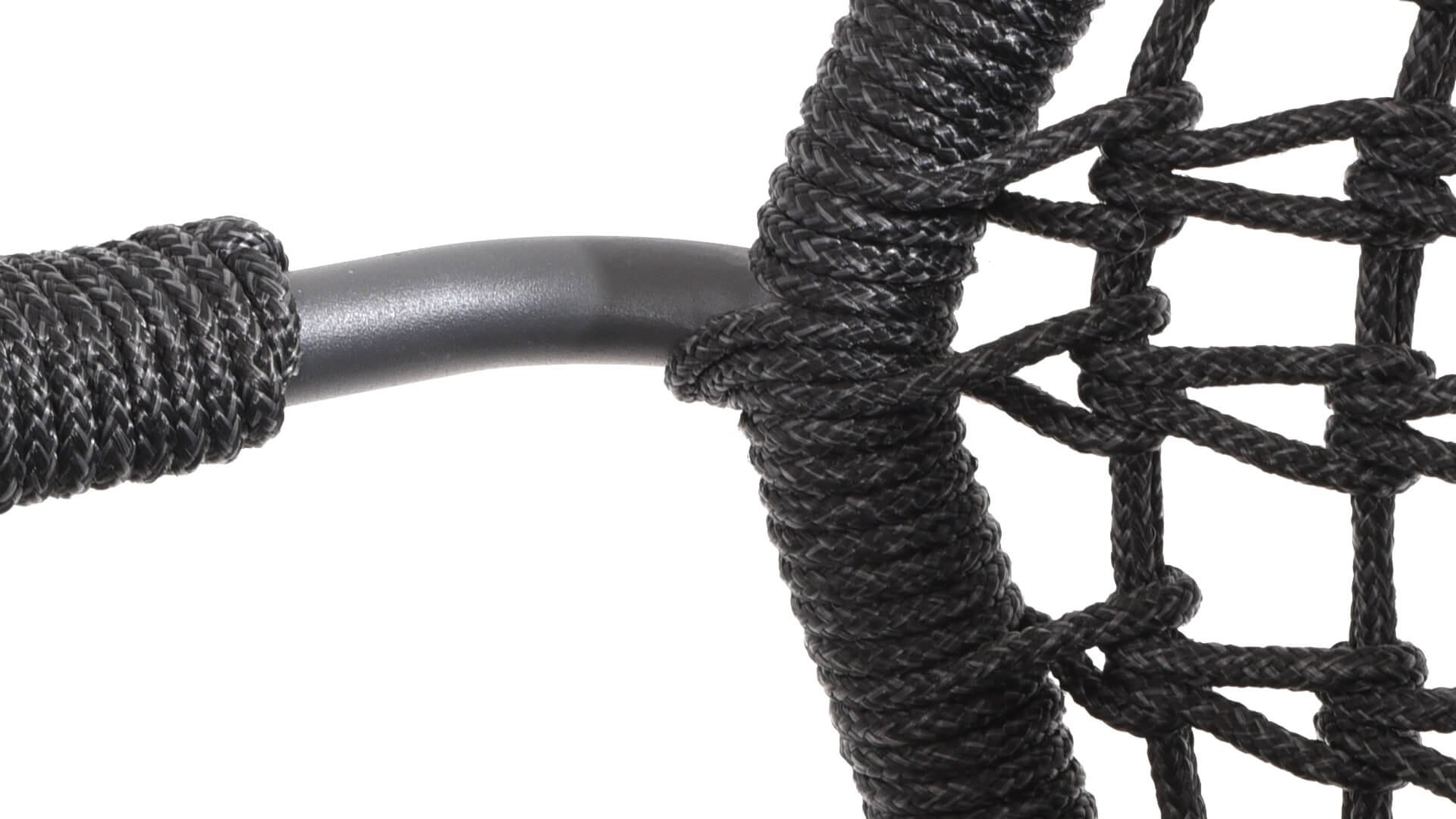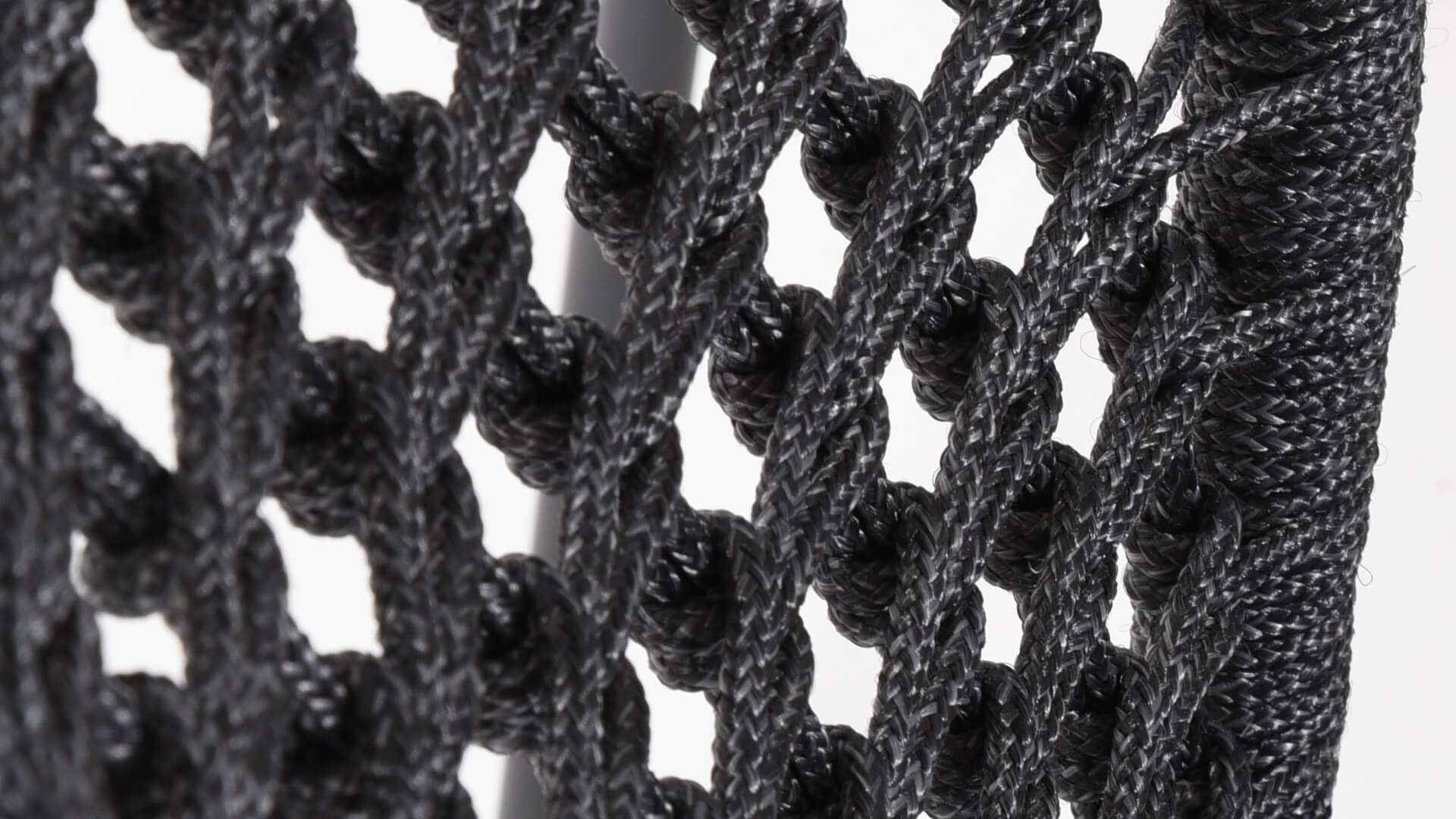 Das Seilmaterial ist witterungsbeständig und im Blockmuster geknüpft. Das Seil wird subtil zu den Armlehnen zurückgeführt.