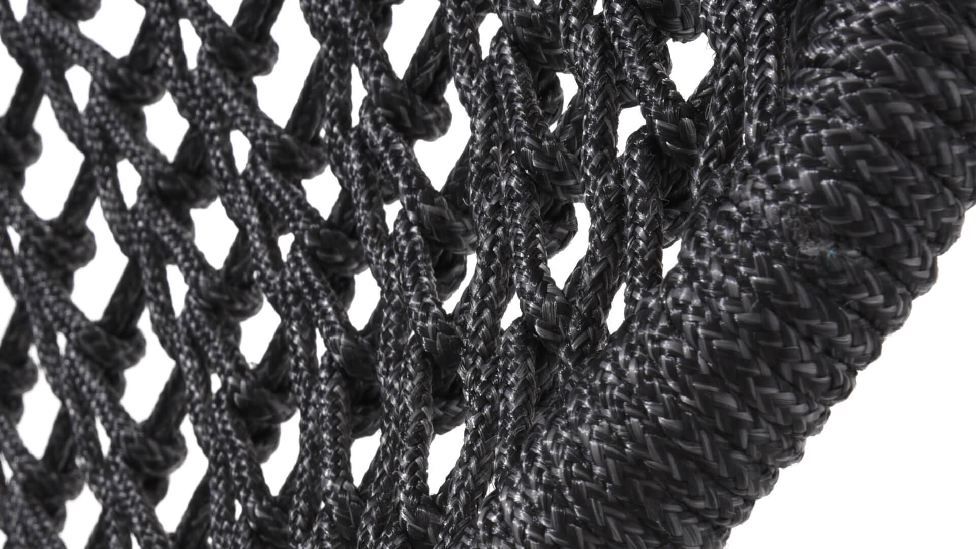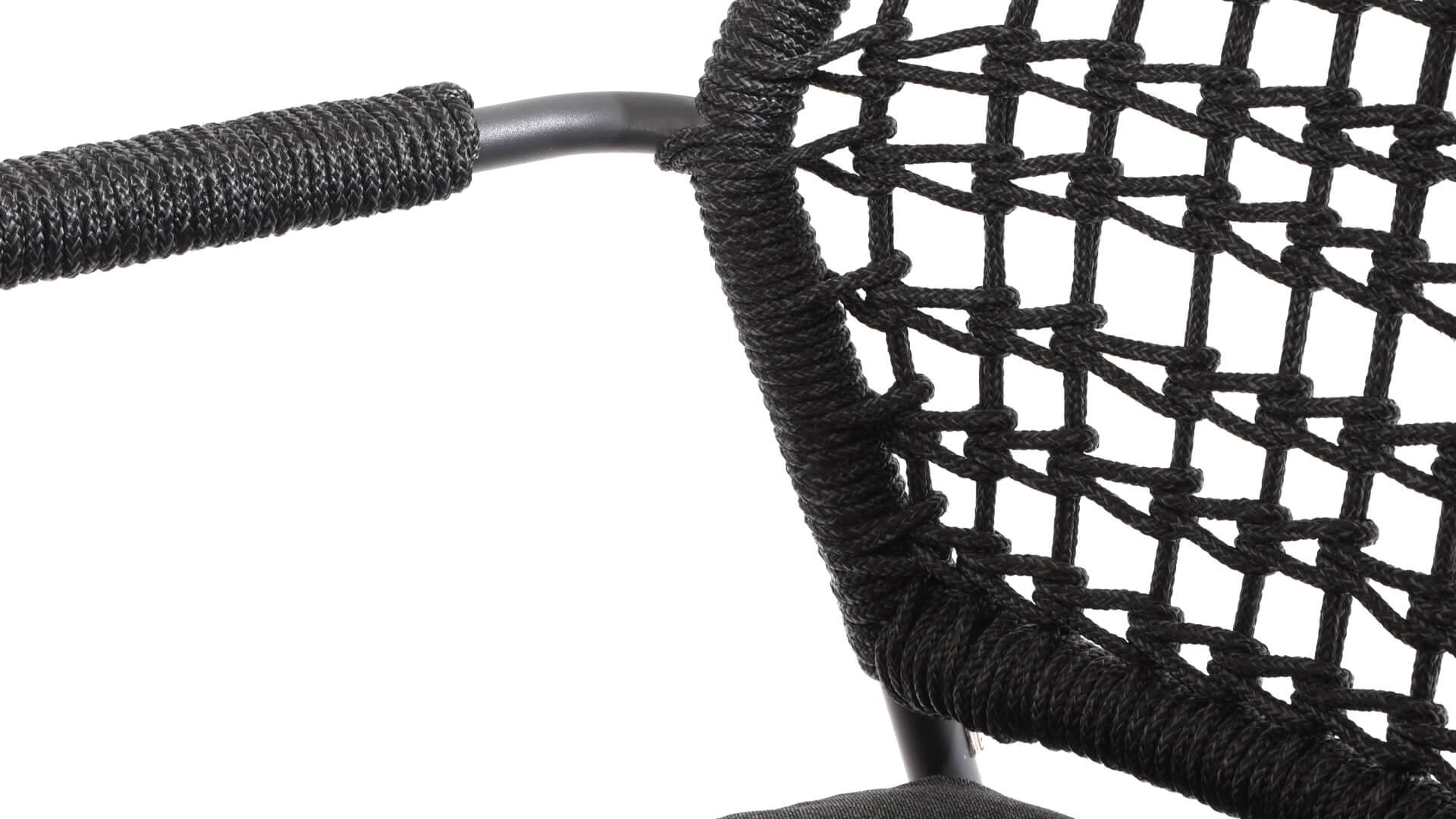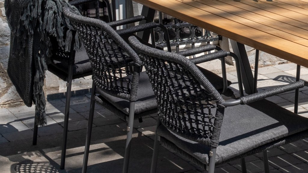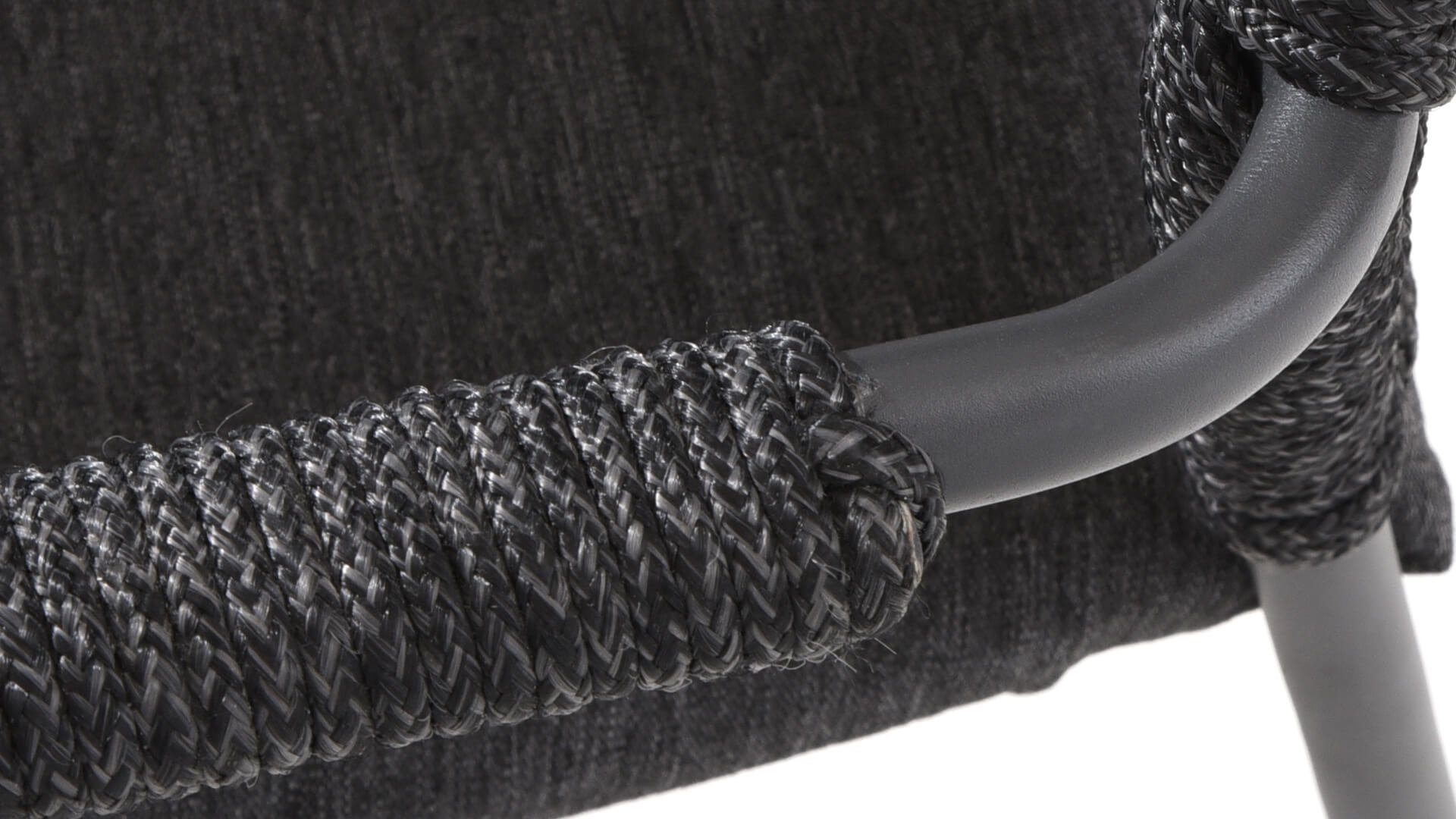 Das Seilmaterial ist witterungsbeständig und im Blockmuster geknüpft. Das Seil wird subtil zu den Armlehnen zurückgeführt.