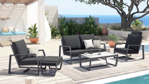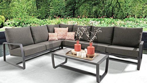 Diese Taste by 4Seasons Sitzgruppe Mauritius überzeugt durch das moderne und dennoch zeitlose Design. Die bequemen Polster der Taste Mauritius sorgen für einen unglaublichen hohen Sitzkomfort. Auf der Terrasse, im Wintergarten oder im Wohnbereich machen die Mauritius Taste by 4Seasons Living Garten Möbel immer einen guten Eindruck. Die Taste Mauritius Loungemöbel basieren auf einem hochwertigen Aluminium Gestell. Dieses ist in Matt Carbon Farbe pulverbeschichtet um vor Witterungseinflüssen geschützt zu sein. Die Kissen sind Semi All-Weather olefin Stoff. Verfugbar in einen Eck-Loungegruppe und Sofa mit Sessel!