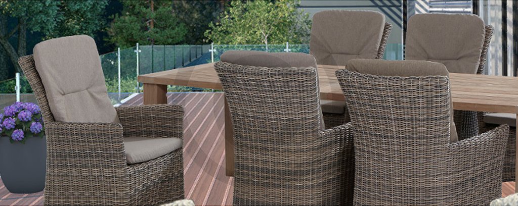Die Gartenmöbel Ancona ist in klassischem traditionellem Design gehalten. Durch die leicht schräge Rückenlehne und die Form der Armlehnen wirkt der Gartenstuhl offen und lädt Sie ein himmlischen Sitzkomfort zu genießen. Im Lieferumfang sind bequeme Sitz- und Rückenkissen enthalten, die das Sitzgefühl perfekt machen. Diese harmonisch abgestimmte Farbgebung lässt sich sehr gut zu vielen (teak) Tischen kombinieren und wird sich sehr gut in das Gesamtbild Ihrer Terrasse einfügen. Um guten Eigenschaften für den Einsatz im Außenbereich zu garantieren wurden nur hochwertige Rohmaterialen verwendet. Das stabile Untergestell ist aus pulverbeschichtetem Aluminium gefertigt, das mit erstklassigem Kunststoffgeflecht umflochten wurde.