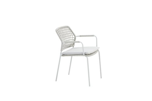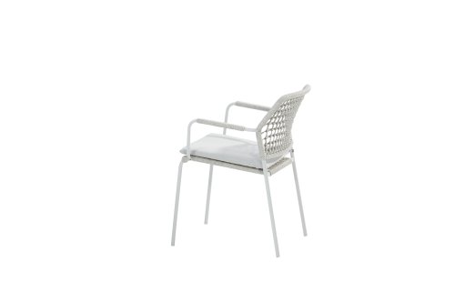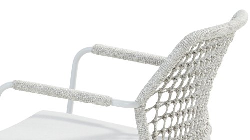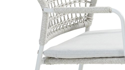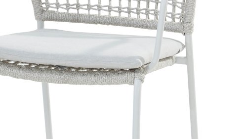 Dieser Stuhl ist in 5 Seilfarben erhältlich: Anthrazit, Grün, Blau, Frozen und Terra Cotta. Sie sehen hier die frozenfarbene Variante. So können Sie wählen, welche Farbe am besten zu Ihrer Terrasse passt, oder Sie können eine schöne Kombination aus 2 oder sogar 5 Farben erstellen. Das Seilmaterial ist witterungsbeständig und im Blockmuster geknüpft. Das Seil wird subtil zu den Armlehnen zurückgeführt.