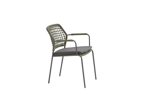 Dieser Stuhl ist in 5 Seilfarben erhältlich: Anthrazit, Grün, Blau, Frozen und Terra Cotta. Sie sehen hier die grünfarbene Variante. So können Sie wählen, welche Farbe am besten zu Ihrer Terrasse passt, oder Sie können eine schöne Kombination aus 2 oder sogar 5 Farben erstellen. Das Seilmaterial ist witterungsbeständig und im Blockmuster geknüpft. Das Seil wird subtil zu den Armlehnen zurückgeführt.