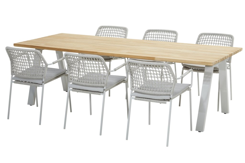 Probieren Sie 4Seasons Barista Dining: voller Geschmack! Der stapelbare Gartenstuhl Barista ist ein echter Alleskönner, herrlich bequem und sehr praktisch und sieht auch noch schick aus. Lässt sich sehr gut mit verschiedenen Arten von Tischen kombinieren. Dieser Stuhl ist in 5 Seilfarben erhältlich: Anthrazit, Grün, Blau, Frozen und Terra Cotta. Sie sehen hier die Weiße Variante. So können Sie wählen, welche Farbe am besten zu Ihrer Terrasse passt, oder Sie können eine schöne Kombination aus 2 oder sogar 5 Farben erstellen. Das Seilmaterial ist witterungsbeständig und im Blockmuster geknüpft. Das Seil wird subtil zu den Armlehnen zurückgeführt.