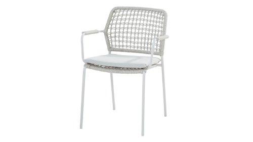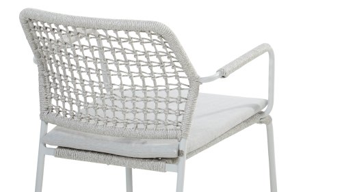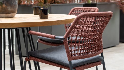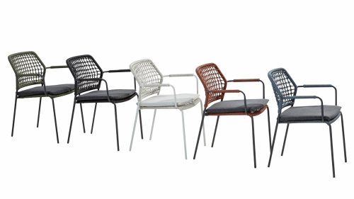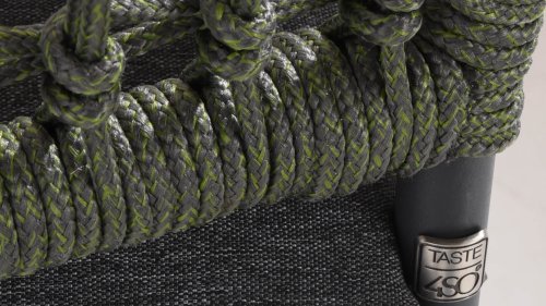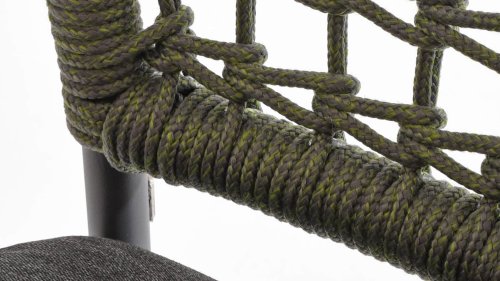 Dieser Stuhl ist in 5 Seilfarben erhältlich: Anthrazit, Grün, Blau, Frozen und Terra Cotta. Sie sehen hier die anthrazitfarbene Variante. So können Sie wählen, welche Farbe am besten zu Ihrer Terrasse passt, oder Sie können eine schöne Kombination aus 2 oder sogar 5 Farben erstellen. Das Seilmaterial ist witterungsbeständig und im Blockmuster geknüpft. Das Seil wird subtil zu den Armlehnen zurückgeführt.