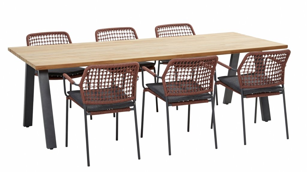 Probieren Sie 4Seasons Barista Dining: voller Geschmack! Der stapelbare Gartenstuhl Barista ist ein echter Alleskönner, herrlich bequem und sehr praktisch und sieht auch noch schick aus. Lässt sich sehr gut mit verschiedenen Arten von Tischen kombinieren. Dieser Stuhl ist in 5 Seilfarben erhältlich: Anthrazit, Grün, Blau, Frozen und Terra Cotta. Sie sehen hier die anthrazitfarbene Variante. So können Sie wählen, welche Farbe am besten zu Ihrer Terrasse passt, oder Sie können eine schöne Kombination aus 2 oder sogar 5 Farben erstellen. Das Seilmaterial ist witterungsbeständig und im Blockmuster geknüpft. Das Seil wird subtil zu den Armlehnen zurückgeführt.
