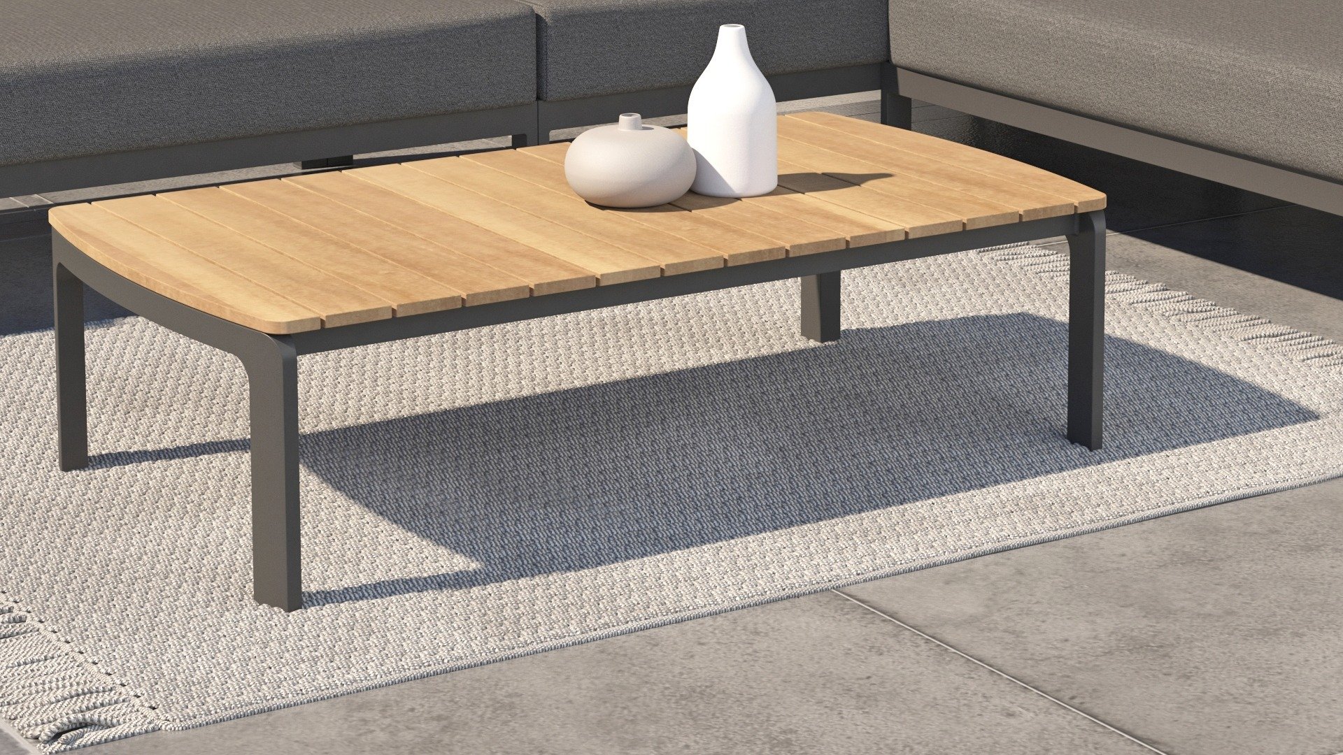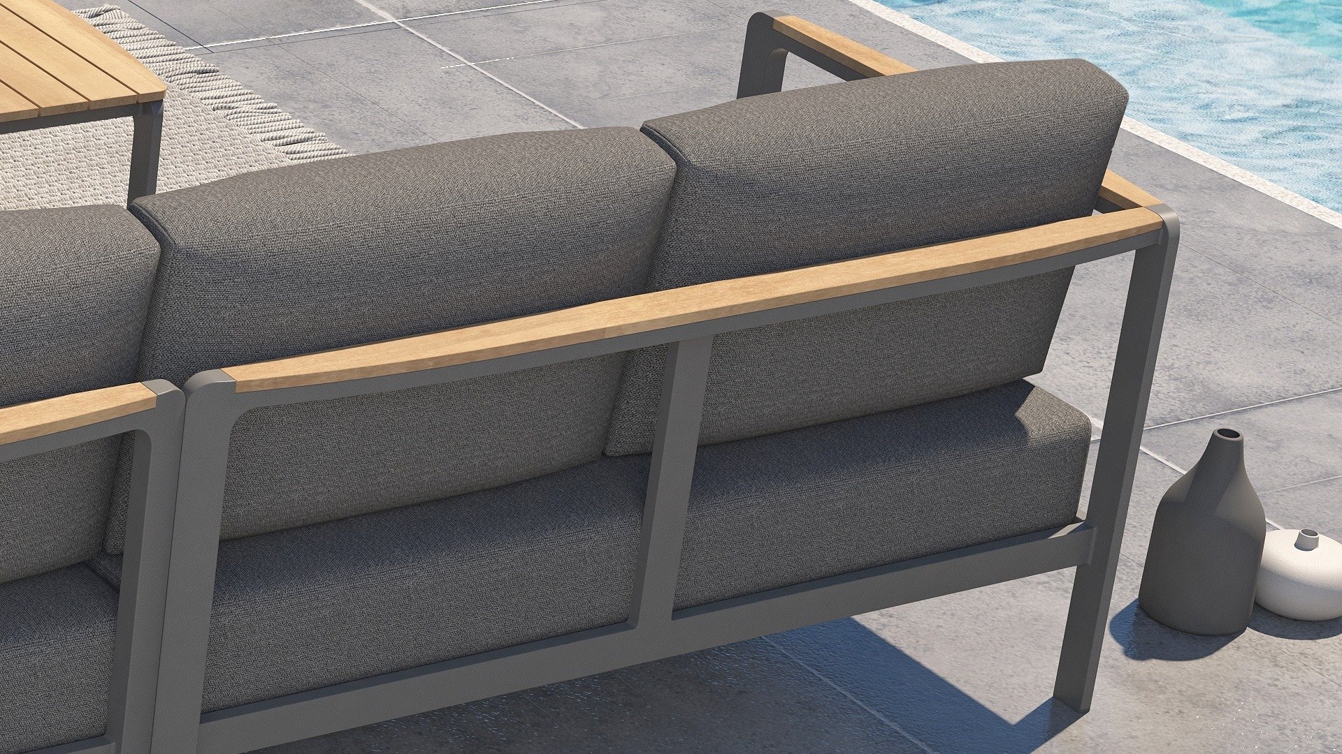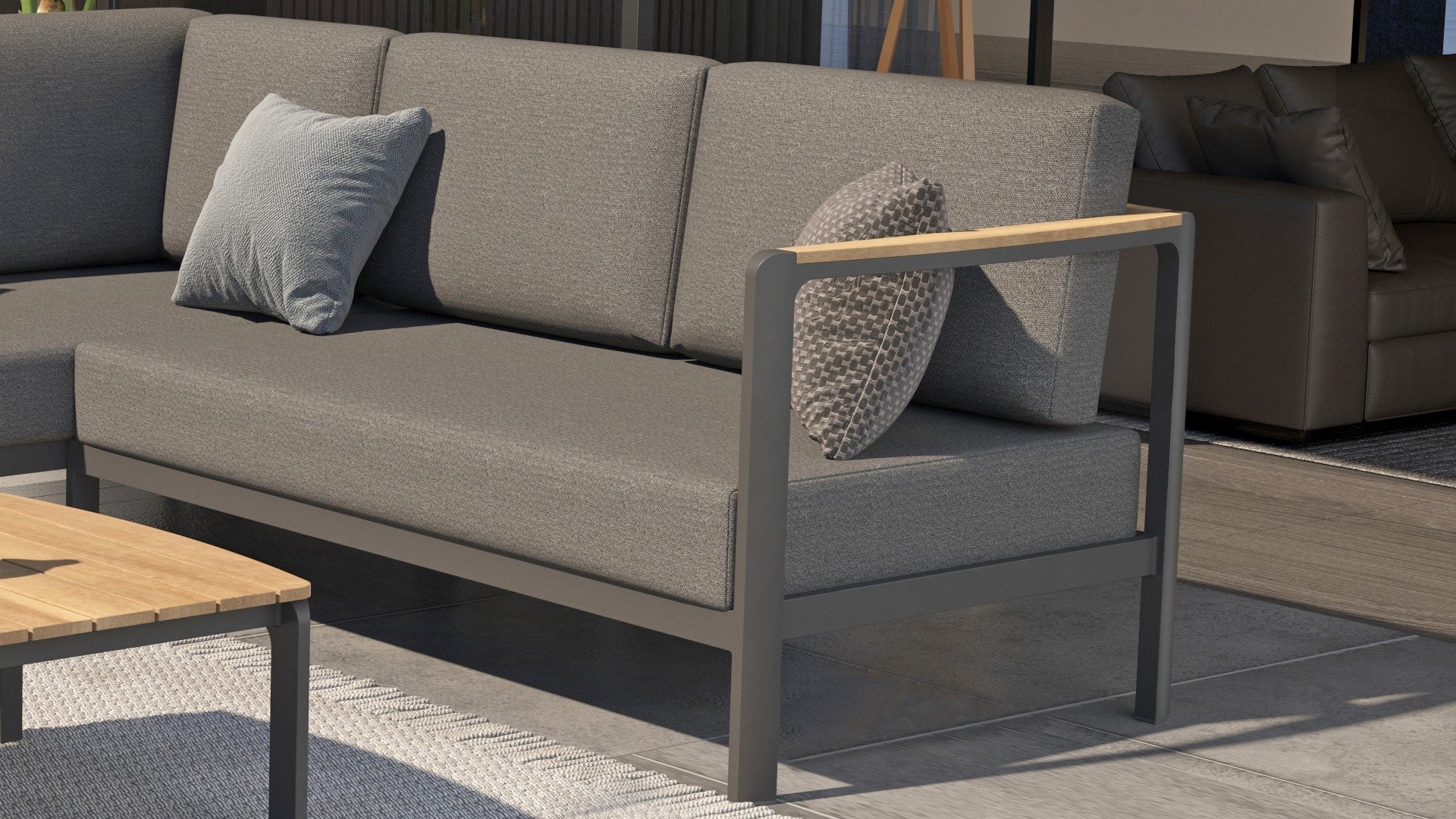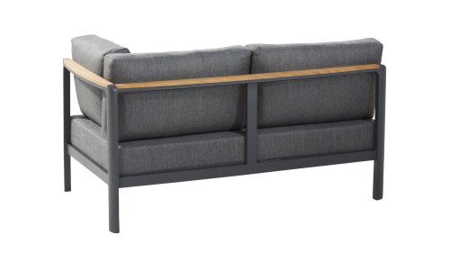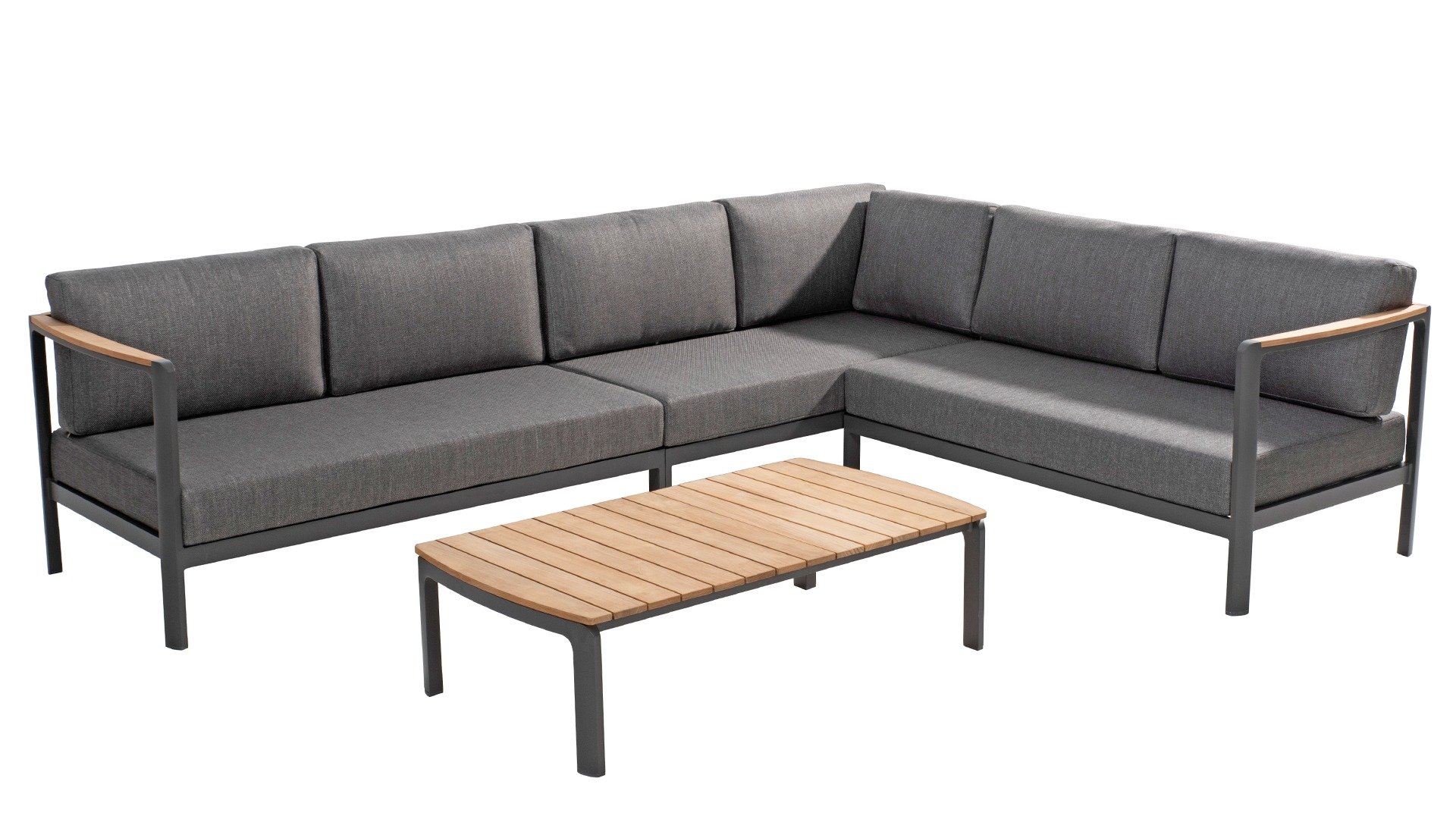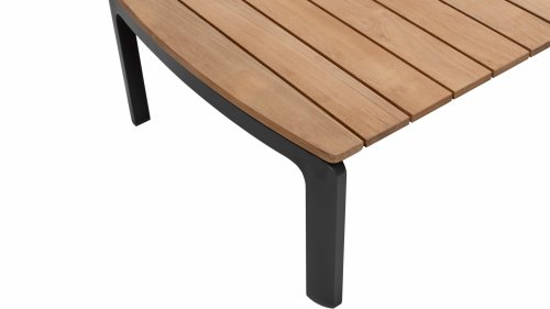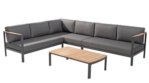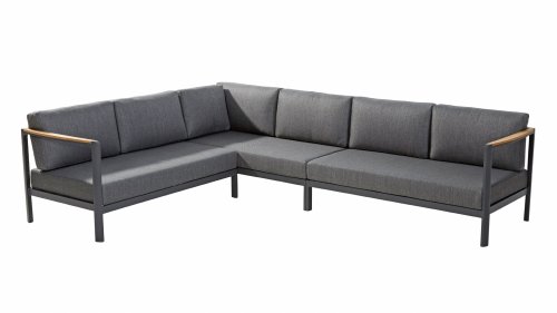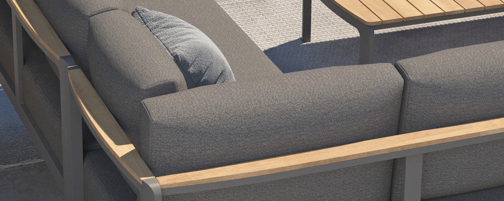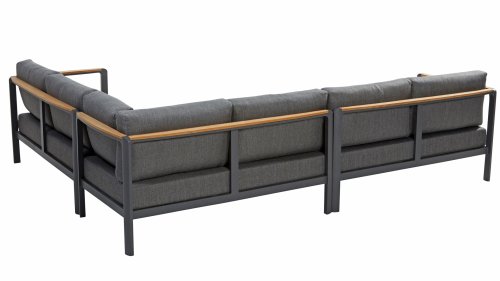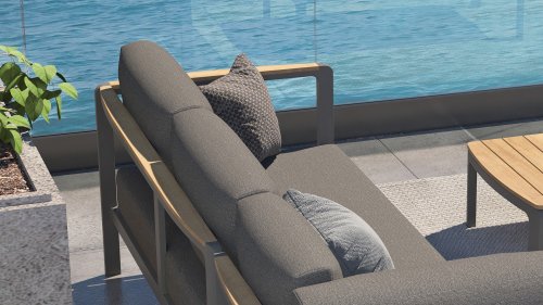 Die Farbkombination mit Teakholz und Aluminium sorgt für eine fantastische Optik! Vor allem durch das fließende Design der komplett in die Rückenlehne verlaufenden Teakholz-Armlehne ist sie ein echter Hingucker und verleiht dem Cortina Lounge Set die Aufmerksamkeit, die es verdient!