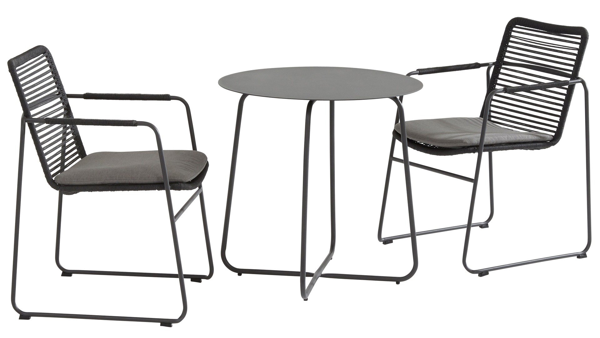Der Elba Dining Chair von Taste by 4Seasons besteht aus einem pulverbeschichteten Edelstahlgestell mit gespanntem Rope. Das Rope hat einen harten Kern, sodass es sich kaum dehnt. In Kombination mit dem serienmäßig mitgelieferten Sitzkissen ist dieser Stapelstuhl sehr bequem. Der Bistrotisch Dali aus Vollaluminium ist sowohl für den Garten als auch für den Balkon eine Bereicherung.