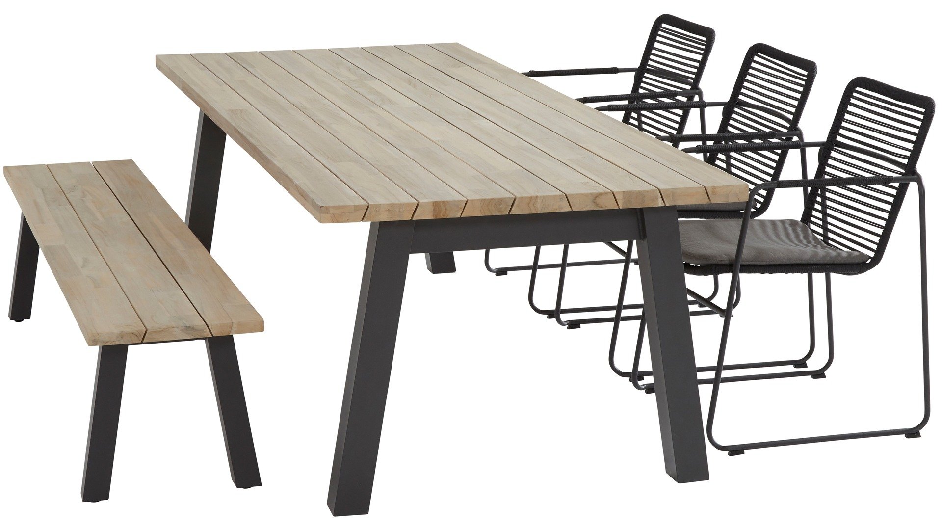 Der Elba Dining Chair von Taste by 4Seasons besteht aus einem pulverbeschichteten Edelstahlgestell mit gespanntem Rope. Das Rope hat einen harten Kern, sodass es sich kaum dehnt. In Kombination mit dem serienmäßig mitgelieferten Sitzkissen ist dieser Stapelstuhl sehr bequem. Die Derbybank ist 200 cm lang. Dies bietet Platz für 3 Erwachsene. Da die Bank etwas kürzer als der Tisch ist, ist das Ein- und Aussteigen einfach.