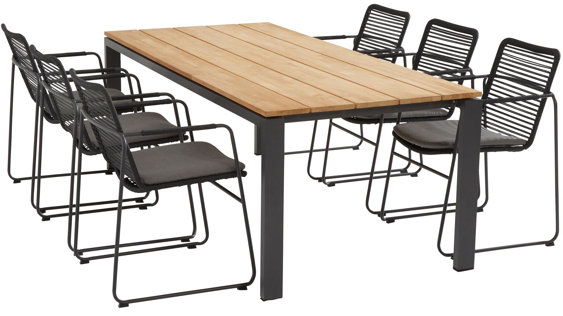 Der Elba Dining Chair von Taste by 4Seasons besteht aus einem pulverbeschichteten Edelstahlgestell mit gespanntem Rope. Das Rope hat einen harten Kern, sodass es sich kaum dehnt. In Kombination mit dem serienmäßig mitgelieferten Sitzkissen ist dieser Stapelstuhl sehr bequem. In Kombination mit dem Goa 220 Alu-Teak wird dieses Set garantiert zum Erfolg in Ihrem Garten.
