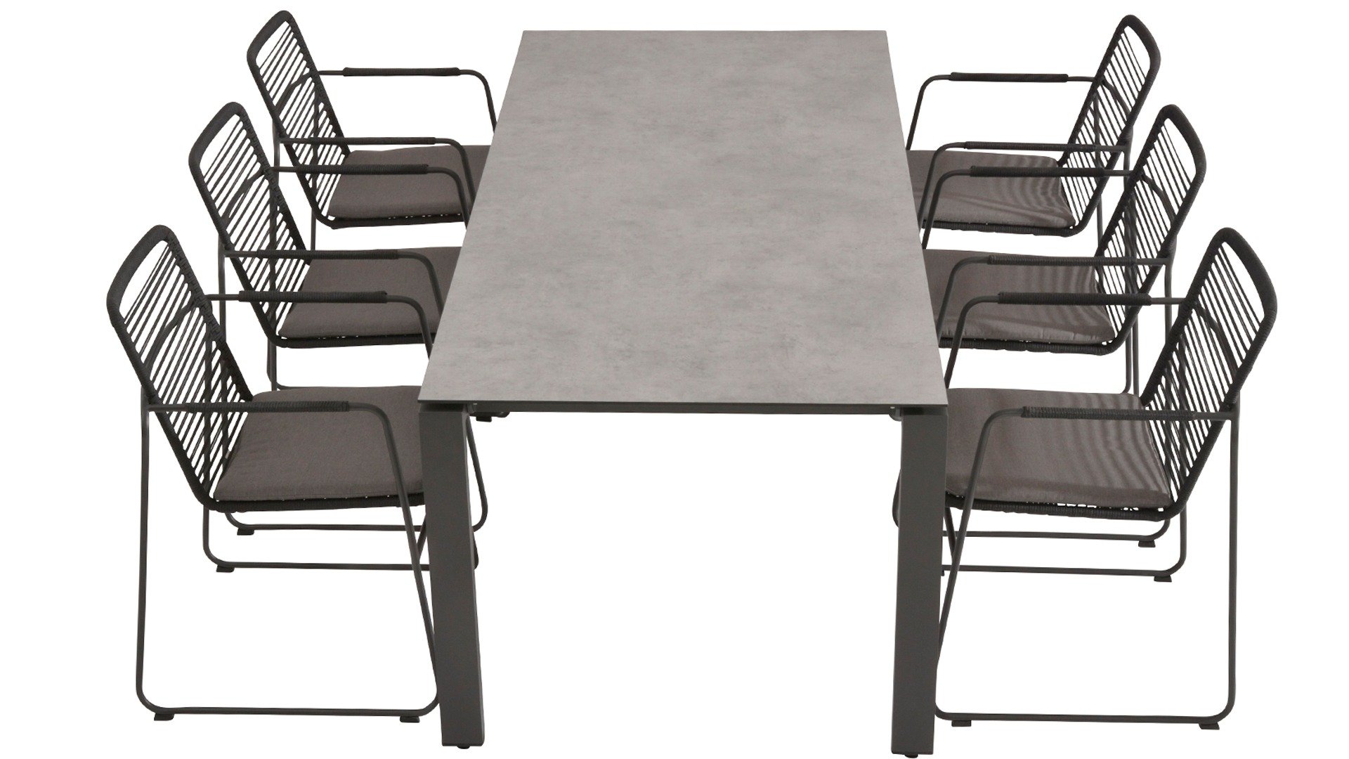 Der Elba Dining Chair von Taste by 4Seasons besteht aus einem pulverbeschichteten Edelstahlgestell mit gespanntem Rope. Das Rope hat einen harten Kern, sodass es sich kaum dehnt. In Kombination mit dem serienmäßig mitgelieferten Sitzkissen ist dieser Stapelstuhl sehr bequem. Der wartungsfreie Goa-Tisch mit HPL-Platte macht dies zu einem eleganten Gartenset.