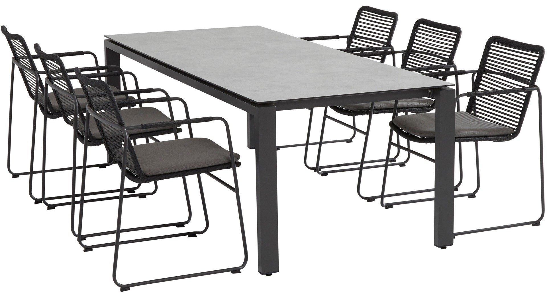 Der Elba Dining Chair von Taste by 4Seasons besteht aus einem pulverbeschichteten Edelstahlgestell mit gespanntem Rope. Das Rope hat einen harten Kern, sodass es sich kaum dehnt. In Kombination mit dem serienmäßig mitgelieferten Sitzkissen ist dieser Stapelstuhl sehr bequem. Der wartungsfreie Goa-Tisch mit HPL-Platte macht dies zu einem eleganten Gartenset.