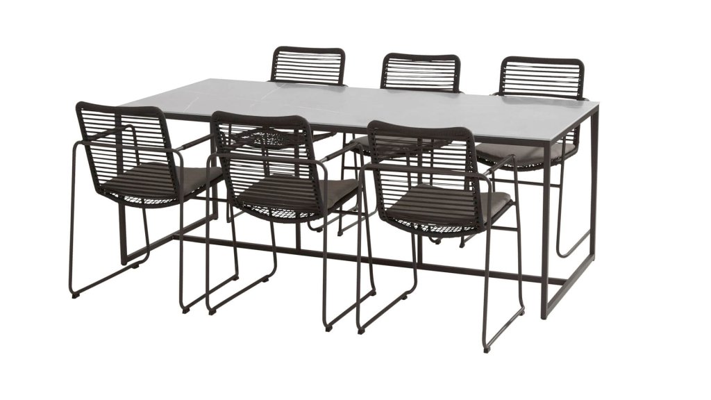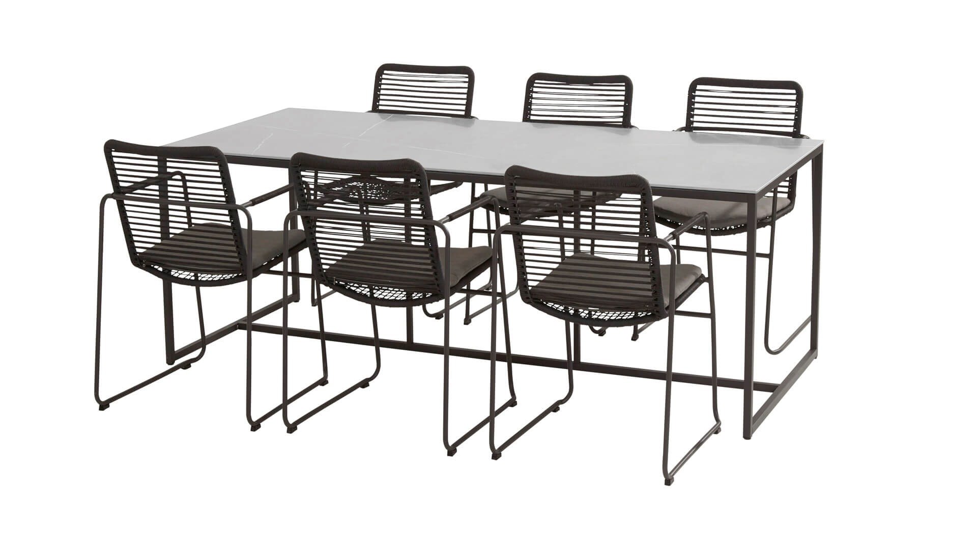 Der Elba Dining Chair von Taste by 4Seasons besteht aus einem pulverbeschichteten Edelstahlgestell mit gespanntem Rope. Das Rope hat einen harten Kern, sodass es sich kaum dehnt. In Kombination mit dem serienmäßig mitgelieferten Sitzkissen ist dieser Stapelstuhl sehr bequem. In Kombination mit den warmen Farben des Basso Tisches ist diese Essgruppe eine Bereicherung für jeden Garten. In Kombination mit dem Quatro-Tisch von 4seasons ergibt sich ein elegantes Ganzes. Der Tisch hat eine Keramikplatte.