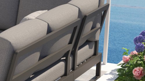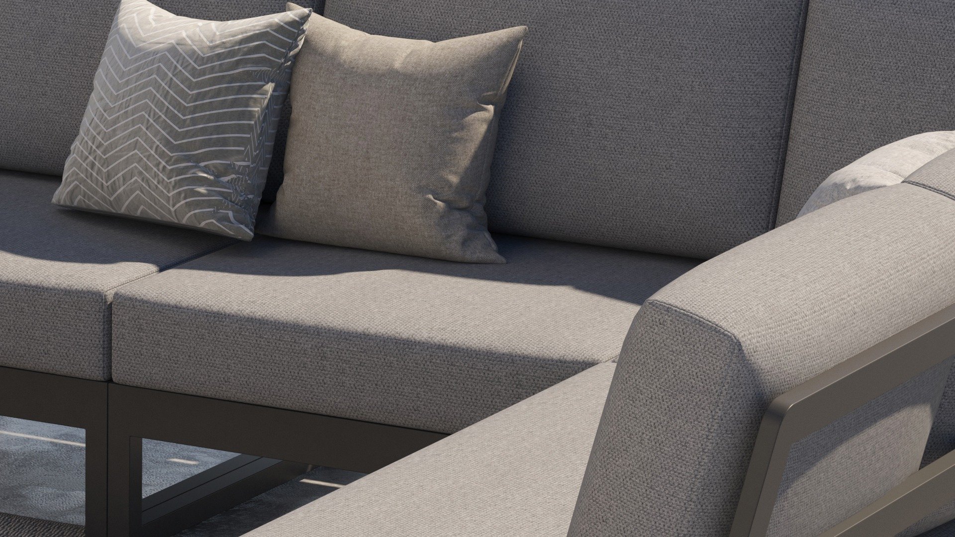 Das Gestell des Taste Matisse besteht aus pulverbeschitetem Aluminium in der Farbe Anthrazit oder White, kombiniert mit den bequemen Olefin-Kissen in der Farbe Hell Grau und (Beistell-)Tischen mit Teakholzdetails entsteht ein Ganzes, das sich sehen lassen kann und von allen Seiten schön ist! Die Kissen haben einen Olefin-Bezug, der abgenommen und bei 30 Grad gewaschen werden kann. Dieser Stoff ist sehr witterungsbeständig und strapazierfähig.