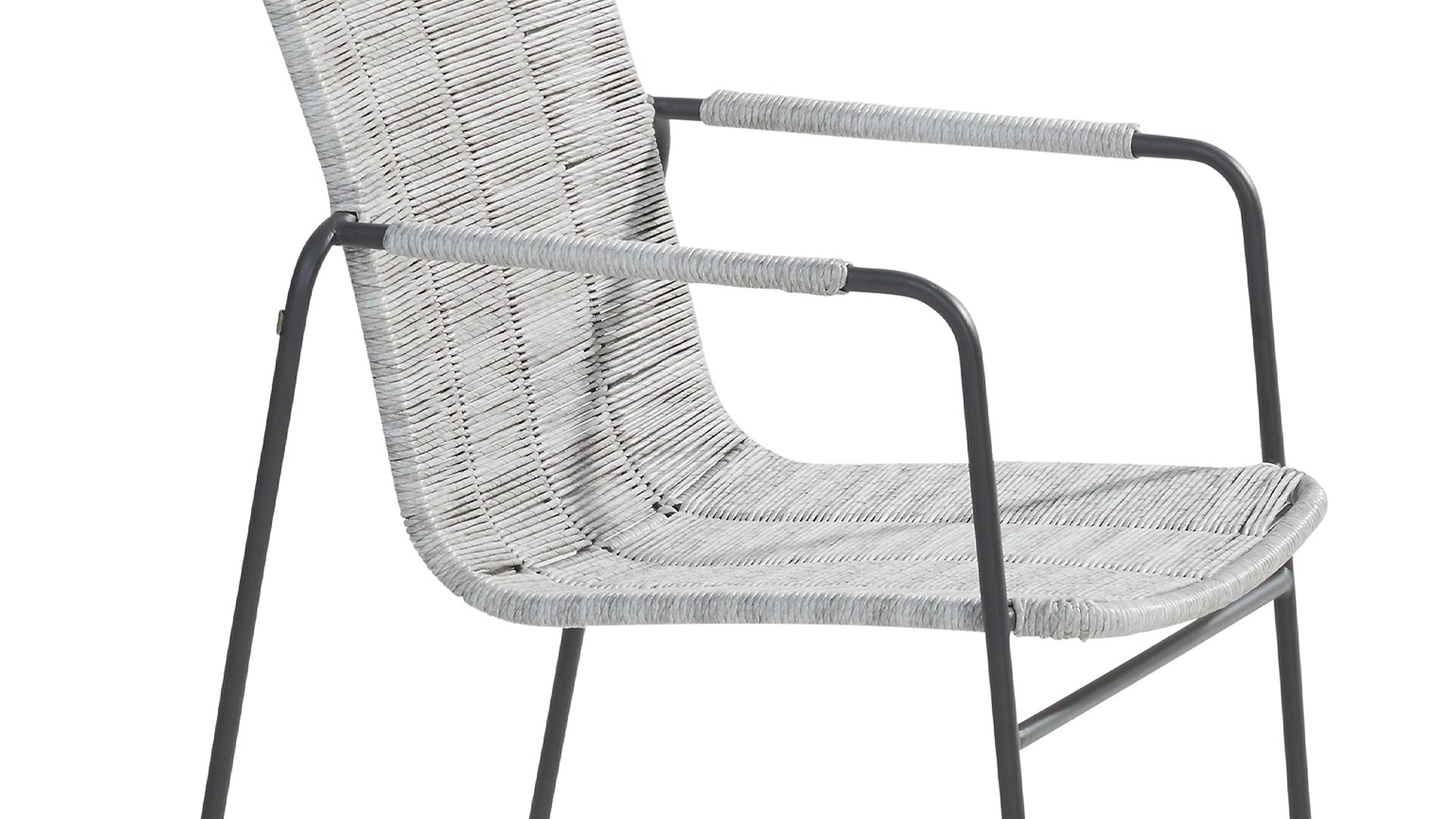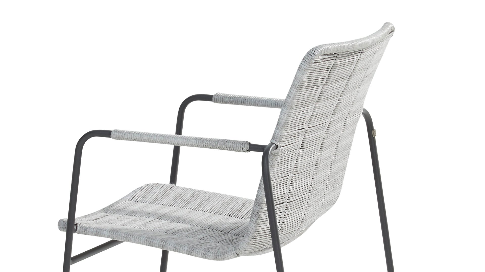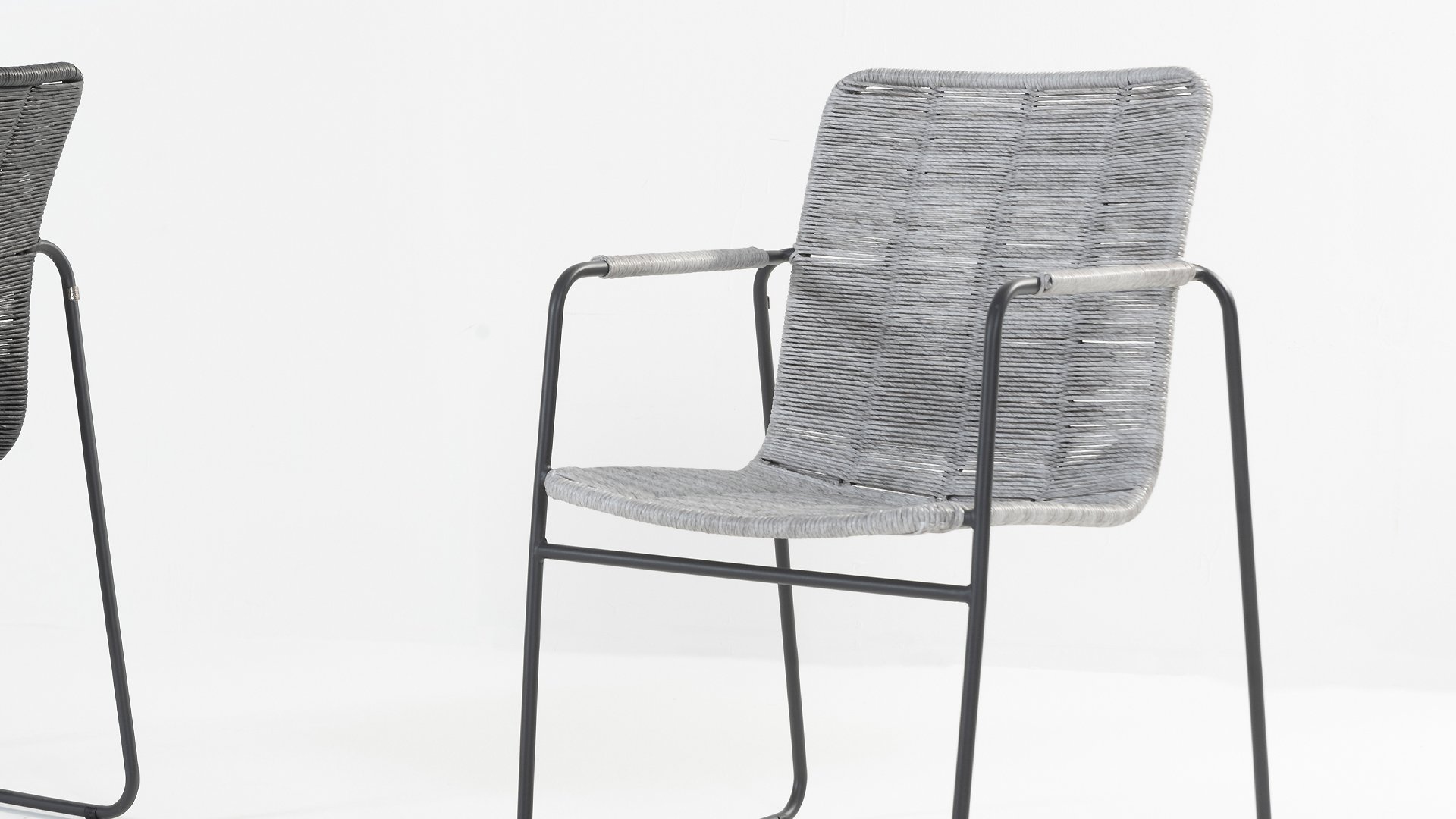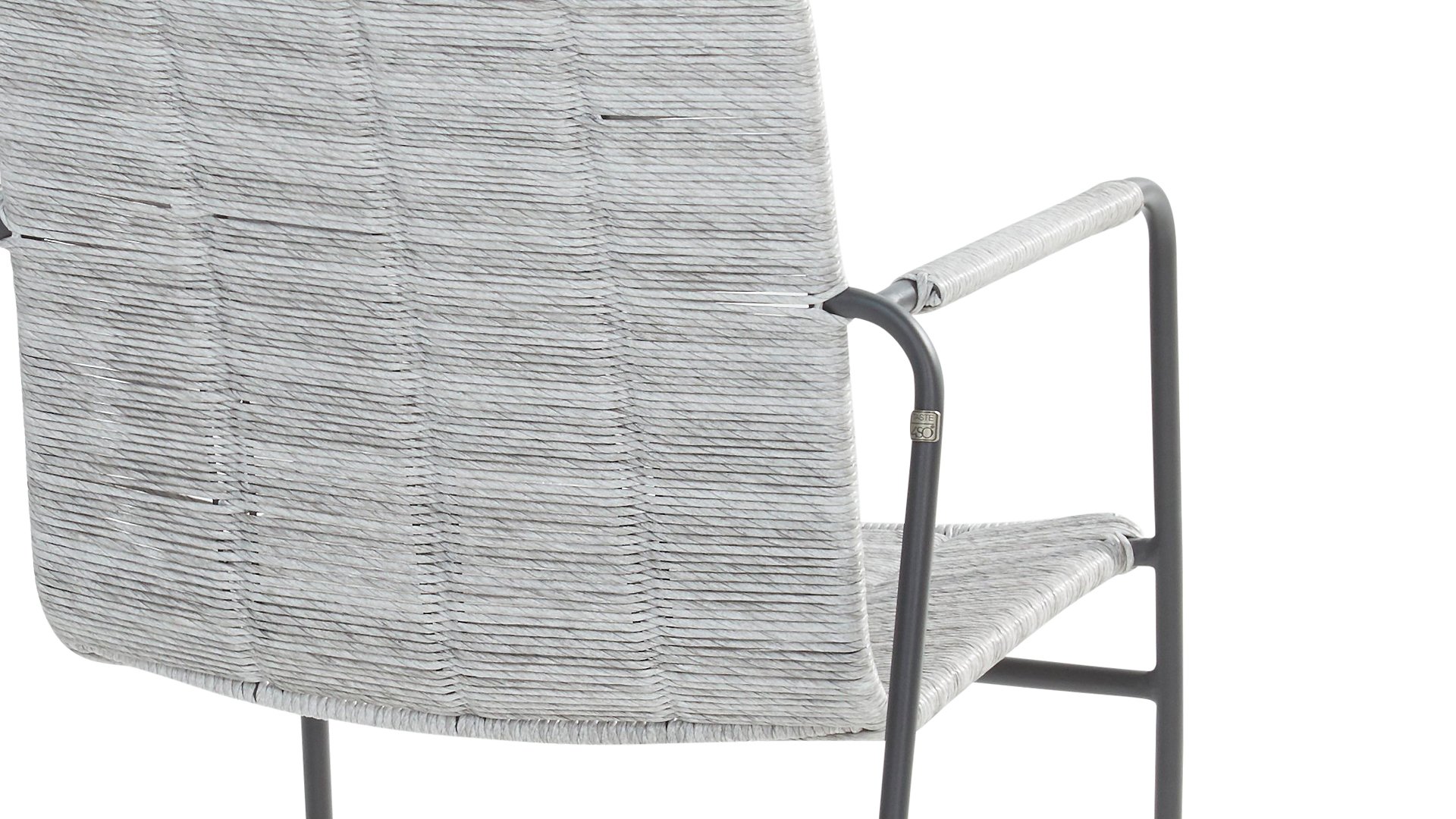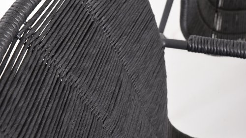 Der anthrazitfarbene Edelstahlrahmen hat aufgrund der dünnen Rundrohre einen starken, aber minimalistischen und industriellen Look. Die abgerundeten Ecken verleihen ihm dennoch einen freundlichen Charakter. Das Material des Palma-Stuhls ist einzigartig in unserer Kollektion. Es ist ein gedrehter Flechtfaden. Es verleiht dem Palma-Stuhl ein natürliches, seilartiges Aussehen. Sowohl die Sitzfläche als auch die Rückenlehne sind aus diesem Material gefertigt und auch die Armlehnen sind mit dem gleichen Gewebe umwickelt.