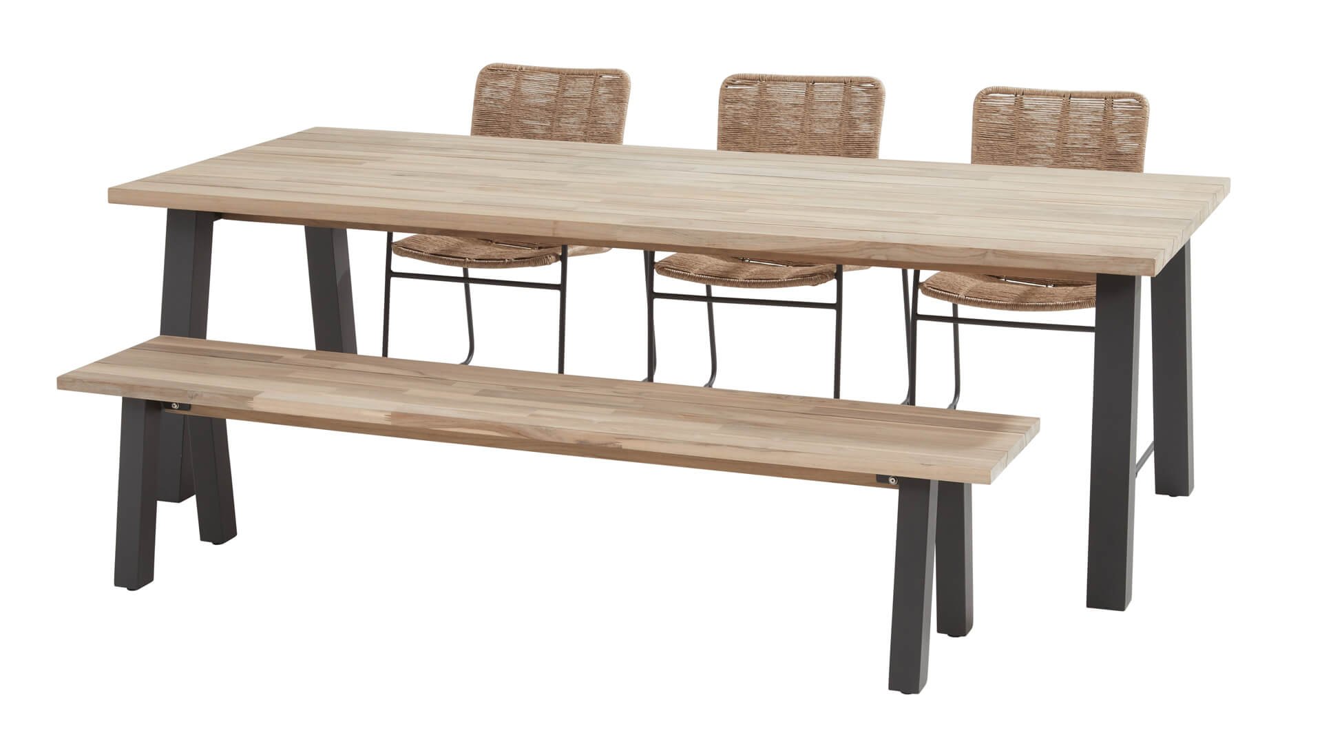 Der Derby 240 mit Aluminiumbein ist ein pragmatischer Esstisch. Die Teakholzplanken sind schräg gesägt und verleihen dem Tisch eine verspielte Optik. Auch mit Teakbeinen erhältlich. Die Teakbank Derby 200 bietet Platz für 3 Erwachsene. Dank seiner etwas kürzeren Maße fällt das Platznehmen und Aufstehen leichter.