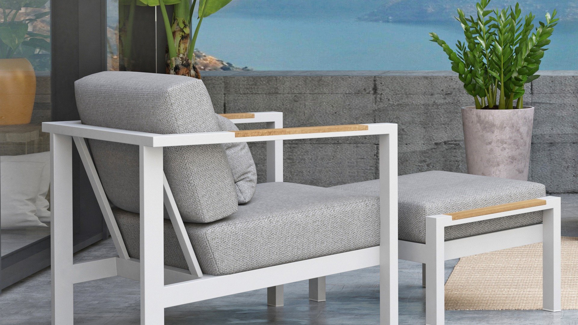 Der Taste Ginger kommt in ruhigen neutralen Farben und passt daher in fast jeden Garten. Das Gestell besteht aus hochwertigem, anthrazit pulverbeschichtetem Aluminium mit witterungsbeständigen Armlehnen aus Teakholz, die grauen Kissen sind extra dick und wirken einladend. Der Stoff ist witterungsbeständig und hat ein robustes Aussehen. Die luxuriösen Kissen haben einen abnehmbaren Bezug aus Olefin-Stoff, der bei 30 Grad gewaschen und getrocknet werden kann. Olefin ist sehr UV-beständig und hält Regen, Kälte und warmen Temperaturen stand.