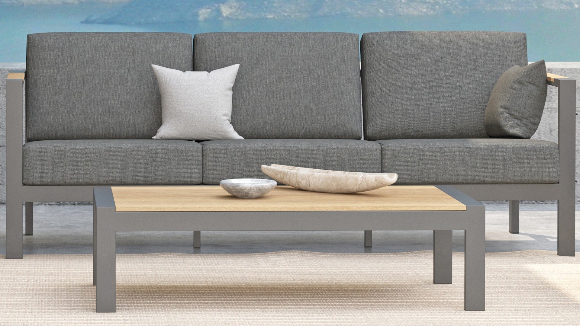 Der Taste Ginger kommt in ruhigen neutralen Farben und passt daher in fast jeden Garten. Das Gestell besteht aus hochwertigem, anthrazit pulverbeschichtetem Aluminium mit witterungsbeständigen Armlehnen aus Teakholz, die grauen Kissen sind extra dick und wirken einladend.