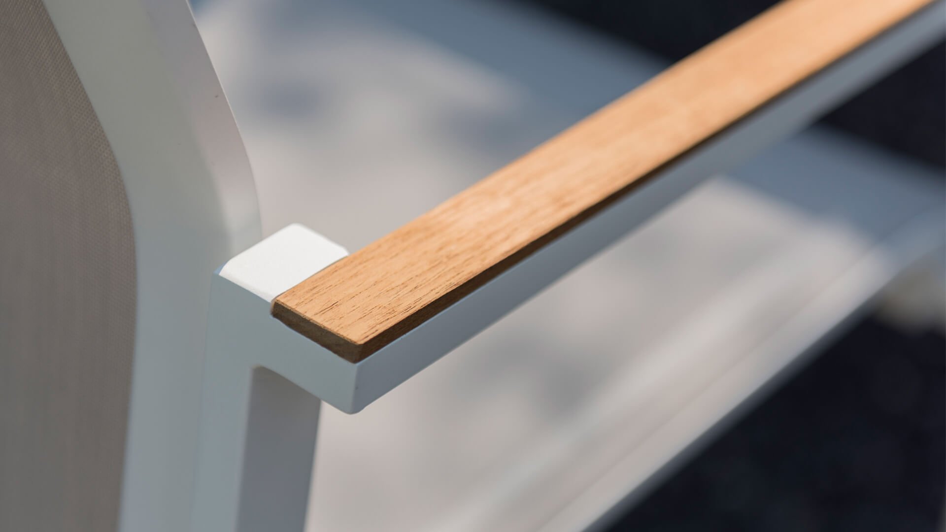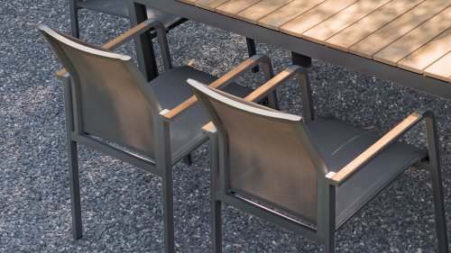 Ihr Stapelsessel Bee verfügt über einen Rahmen aus pulverbeschichtetem Aluminium. Aluminium vereint ein geringes Gewicht mit einer hohen Robustheit. Erhältlich ist das Gestell in den Farben graphite und white. Die hochwertige Textilgewebe-Bespannung, in carbon grey zu Gestell graphite oder light grey zu Gestell white, zeichnet sich durch besondere Eigenschaften aus. Sie ist absolut reißfest, UV-beständig, wetterfest und formstabil. Ebenso ist das Gewebe äußerst pflegeleicht und schmutzabweisend. Die Armlehnen sind aus Teakholz. Teakholz gilt als das beste Holz für Möbel im Außenbereich. Es muss nicht imprägniert oder besonders schutzbehandelt werden.