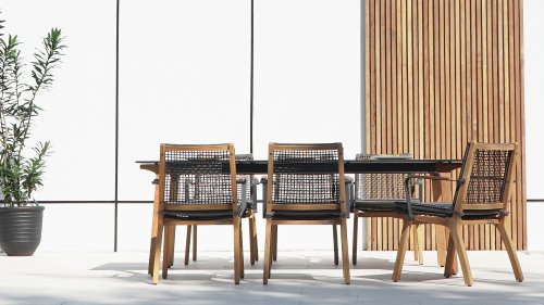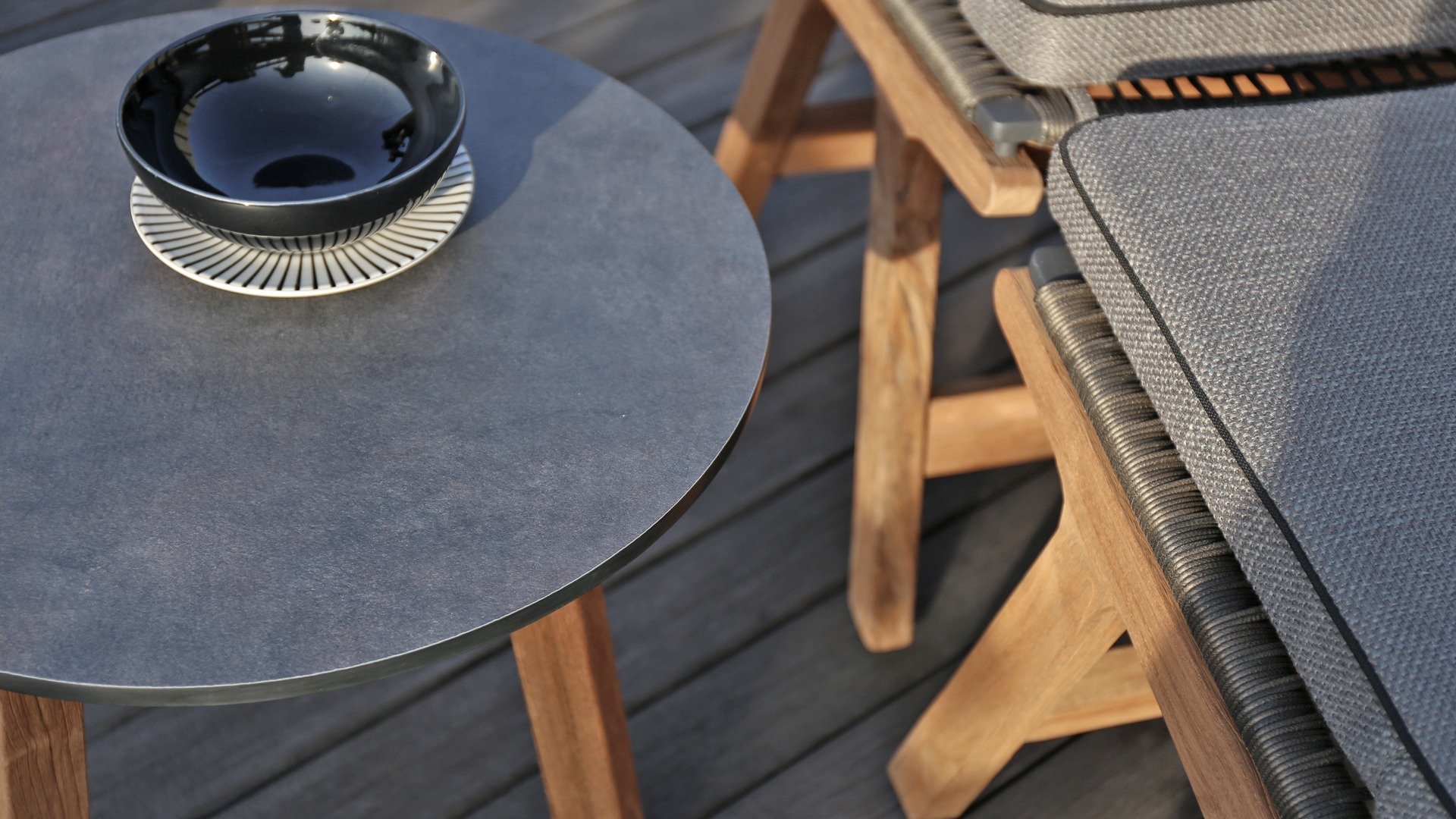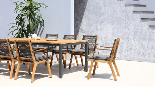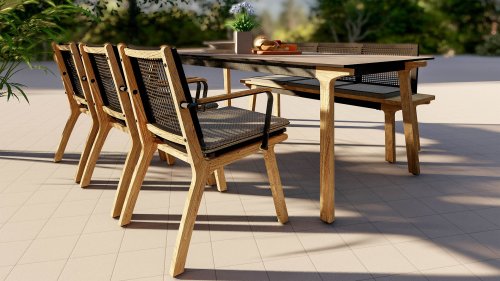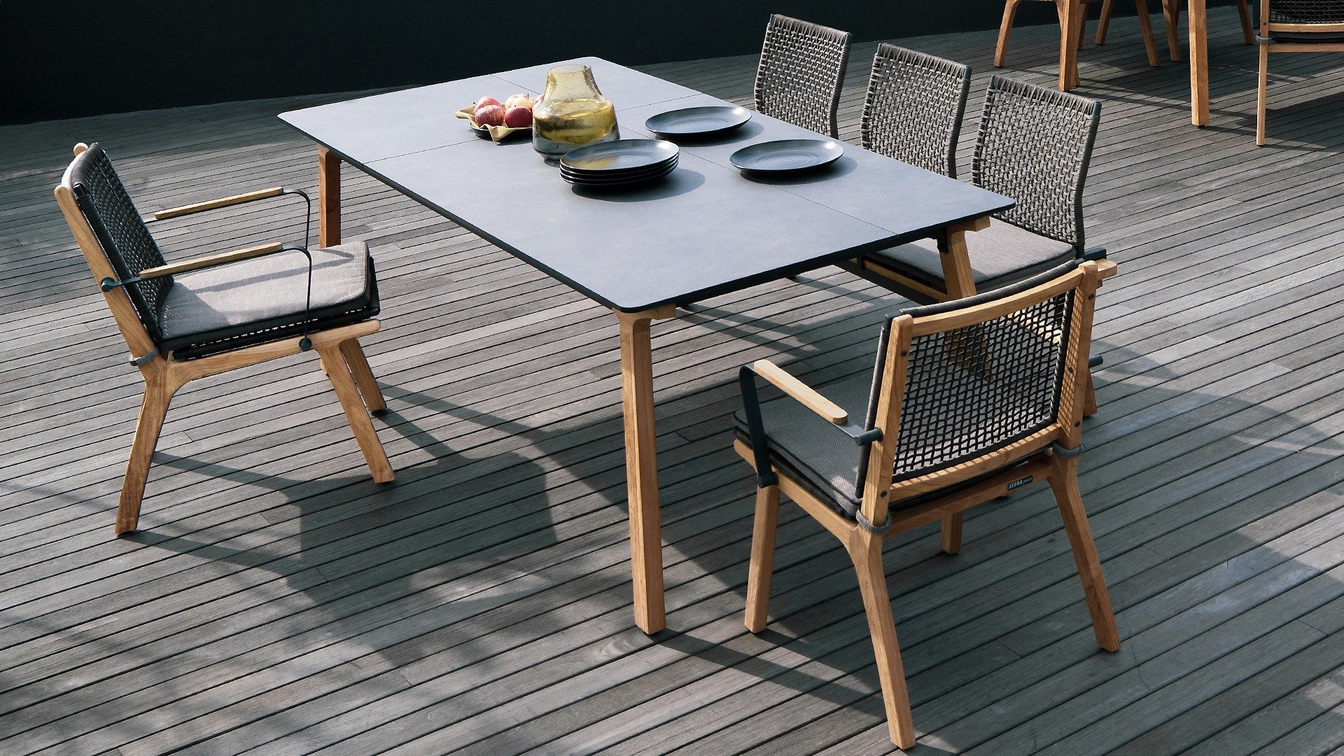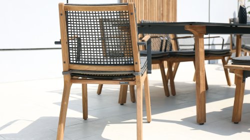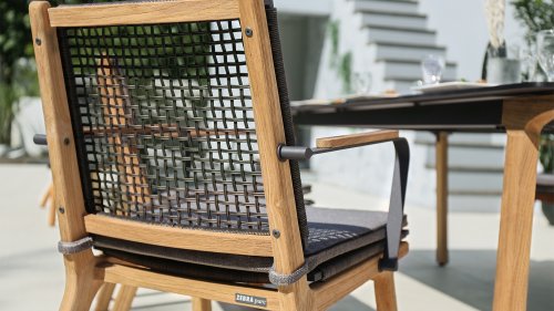 Das harmonische und zugleich kontrastreiche Farbspiel von Tisch Lenyx ist auch bei den dazu passenden Sitzmöbeln der Serie zu finden: ein Rahmen aus pulverbeschichtetem Aluminium in „graphite“ umflochten von Rope-Gewebe in „brown-brushed“ bildet die Sitzfläche sowie Rückenlehne, die von einem stabilen Gestell aus gebürstetem Teakholz getragen werden. Filigran gearbeitete Armlehnen aus pulverbeschichtetem Aluminium und Teakholz wirken elegant und unaufdringlich. Die 3-Sitzerbank der ZEBRA pure Serie Lenyx besteht aus gebürstetem Teakholz. Sitzfläche und Rückenlehne aus Rope-Gewebe bilden eine Einheit und werden für noch mehr Komfort auf die Bank gesteckt.