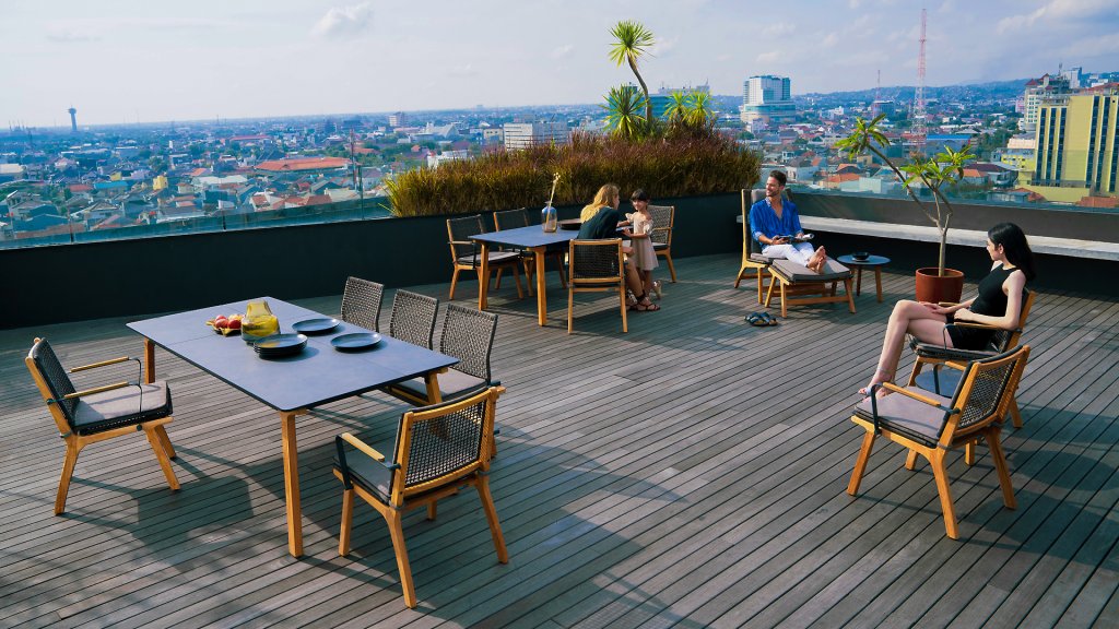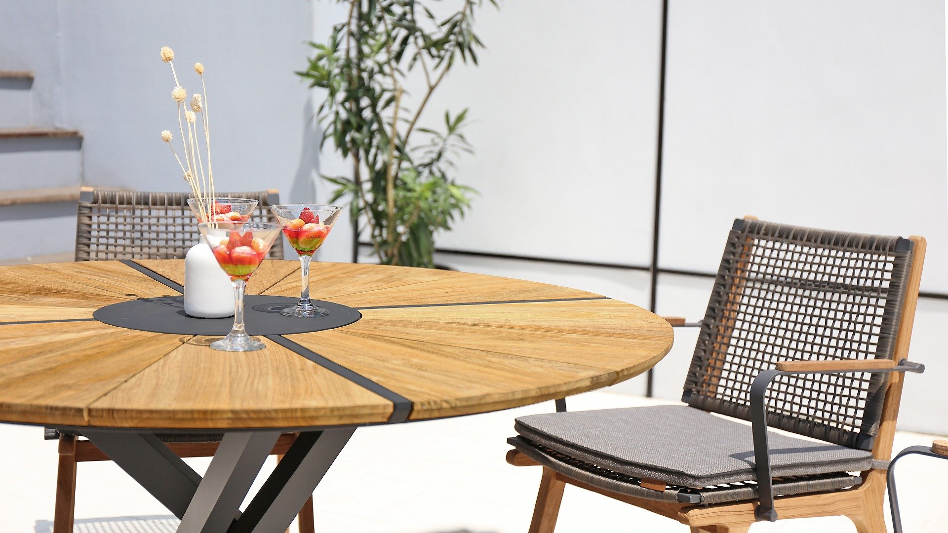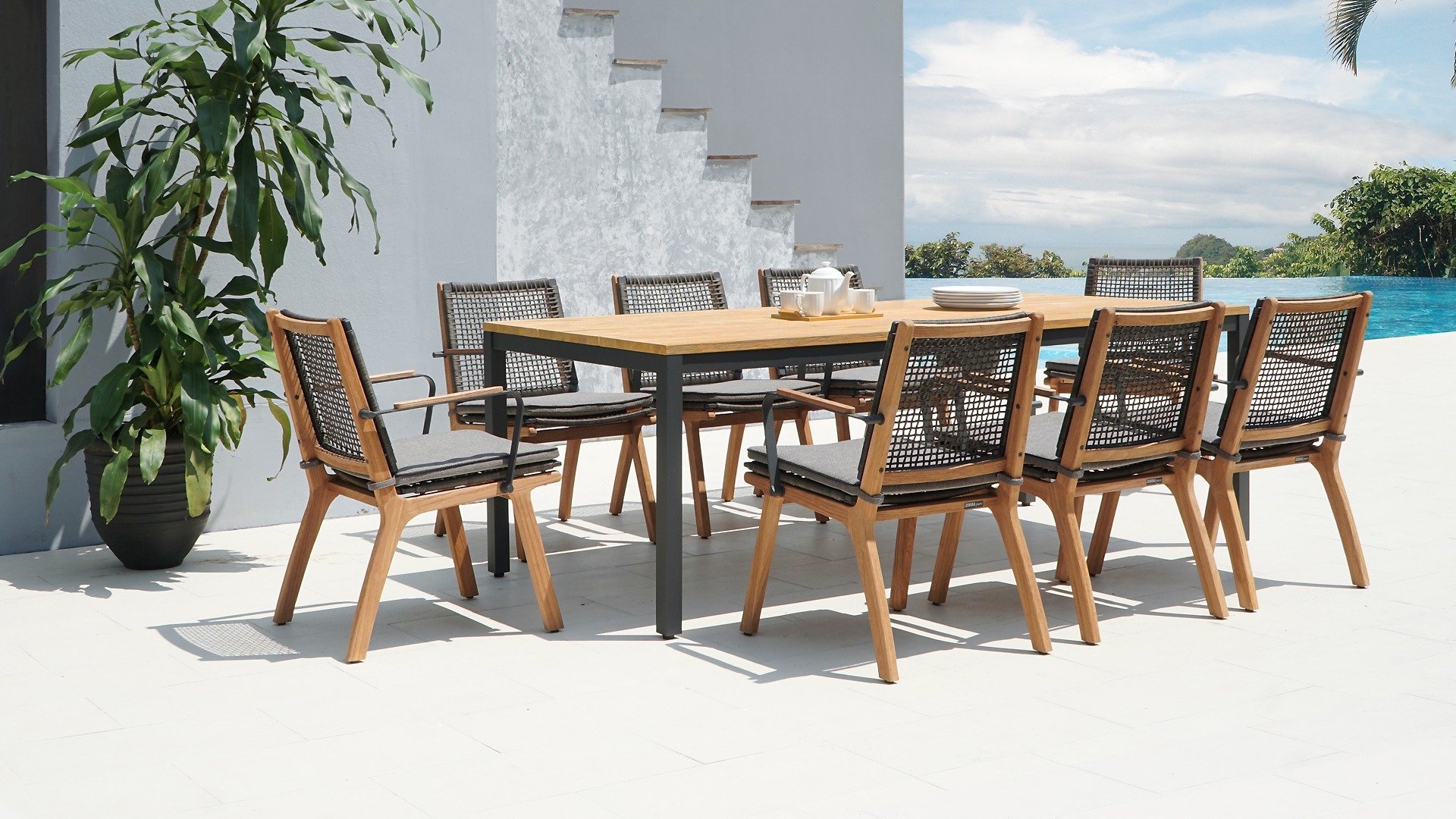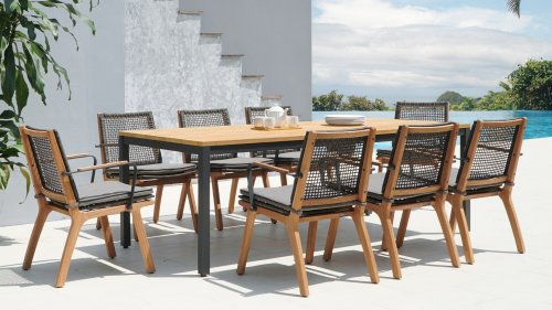 Das harmonische und zugleich kontrastreiche Farbspiel von Tisch Lenyx ist auch bei den dazu passenden Sitzmöbeln der Serie zu finden: ein Rahmen aus pulverbeschichtetem Aluminium in „graphite“ umflochten von Rope-Gewebe in „brown-brushed“ bildet die Sitzfläche sowie Rückenlehne, die von einem stabilen Gestell aus gebürstetem Teakholz getragen werden. Filigran gearbeitete Armlehnen aus pulverbeschichtetem Aluminium und Teakholz wirken elegant und unaufdringlich. Die 3-Sitzerbank der ZEBRA pure Serie Lenyx besteht aus gebürstetem Teakholz. Sitzfläche und Rückenlehne aus Rope-Gewebe bilden eine Einheit und werden für noch mehr Komfort auf die Bank gesteckt.