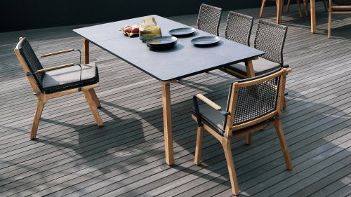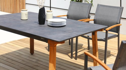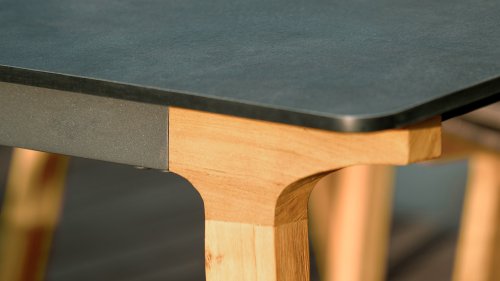 Lenyx heißt die neue Serie der ZEBRA pure-Kollektion. Raffiniert kombiniert kommen bei Lenyx lebhafte Kontraste von Farben und Materialien mit einem klassischen skandinavischen Designansatz zusammen. Die rechteckige Tischplatte mit einer Länge von 160 Zentimetern oder wahlweise 220 Zentimetern besteht aus HPL in dem Farbton „volcanic stone“ und bietet Platz für 6 bzw. 8 Personen. Die Tischplatte mit schlanker Silhouette und abgerundeten Ecken wird von vier schräg angeordneten Tischbeinen aus gebürstetem Teakholz getragen.