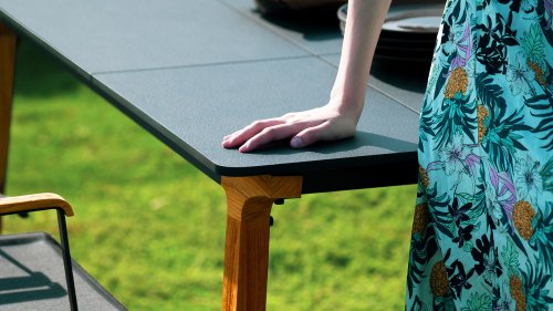 Der Zebra Lenyx Tisch ist mit Teakbeinen und einer HPL-Platte ausgestattet. Ein modisches Design, das sich natürlich gut mit dem Lenyx Gartenstuhl kombinieren lässt.