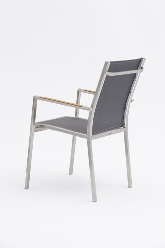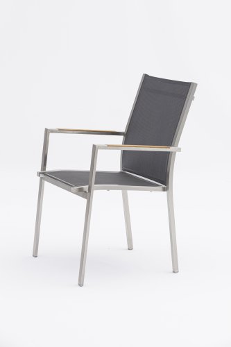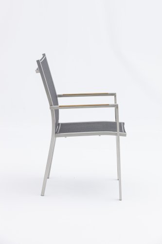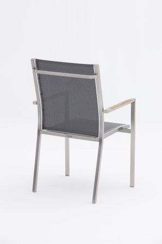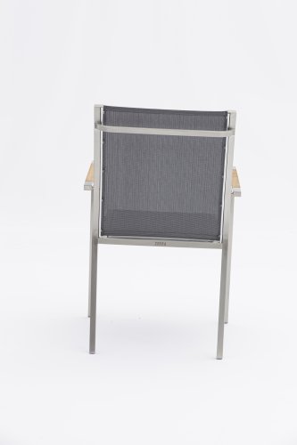 Die Zebra One-Serie. Der Rahmen aus gebürstetem Edelstahl ist mit einem Dark grey oder Dark platinum Textilene-Stoff bezogen. Dieser Edelstahl-Stapelstuhl 'One' von Zebra ist nicht nur ein ergonomisch perfektionierter Stuhl, sondern überzeugt auch durch sein minimalistisches Design und fein eingelassene Armlehnen aus Teakholz oder Textilene in Edelstahl. Der Zebra One Gartenstuhl zeichnet sich, wie bei Stapelstühlen üblich, durch eine höhere Rückenlehne aus und schafft so einen wunderbaren Sitzkomfort. In derselben Zebra One-Serie gibt es auch den verstellbaren/faltbaren Stuhl.