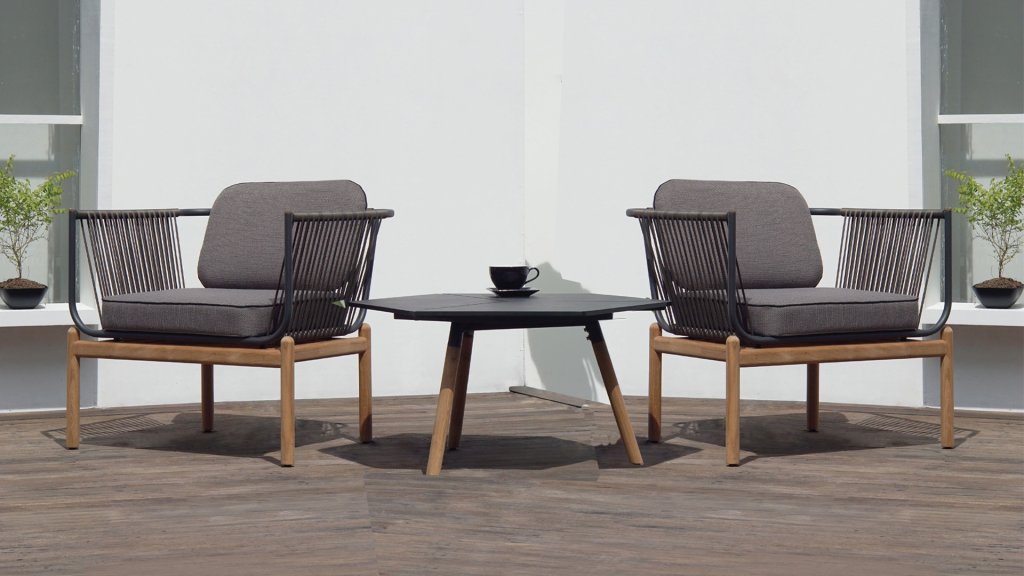| Materialien Loungegruppe | Rope, Teak, Pulverbeschichtet Aluminium/Stahl |