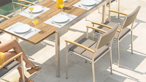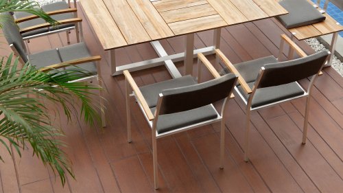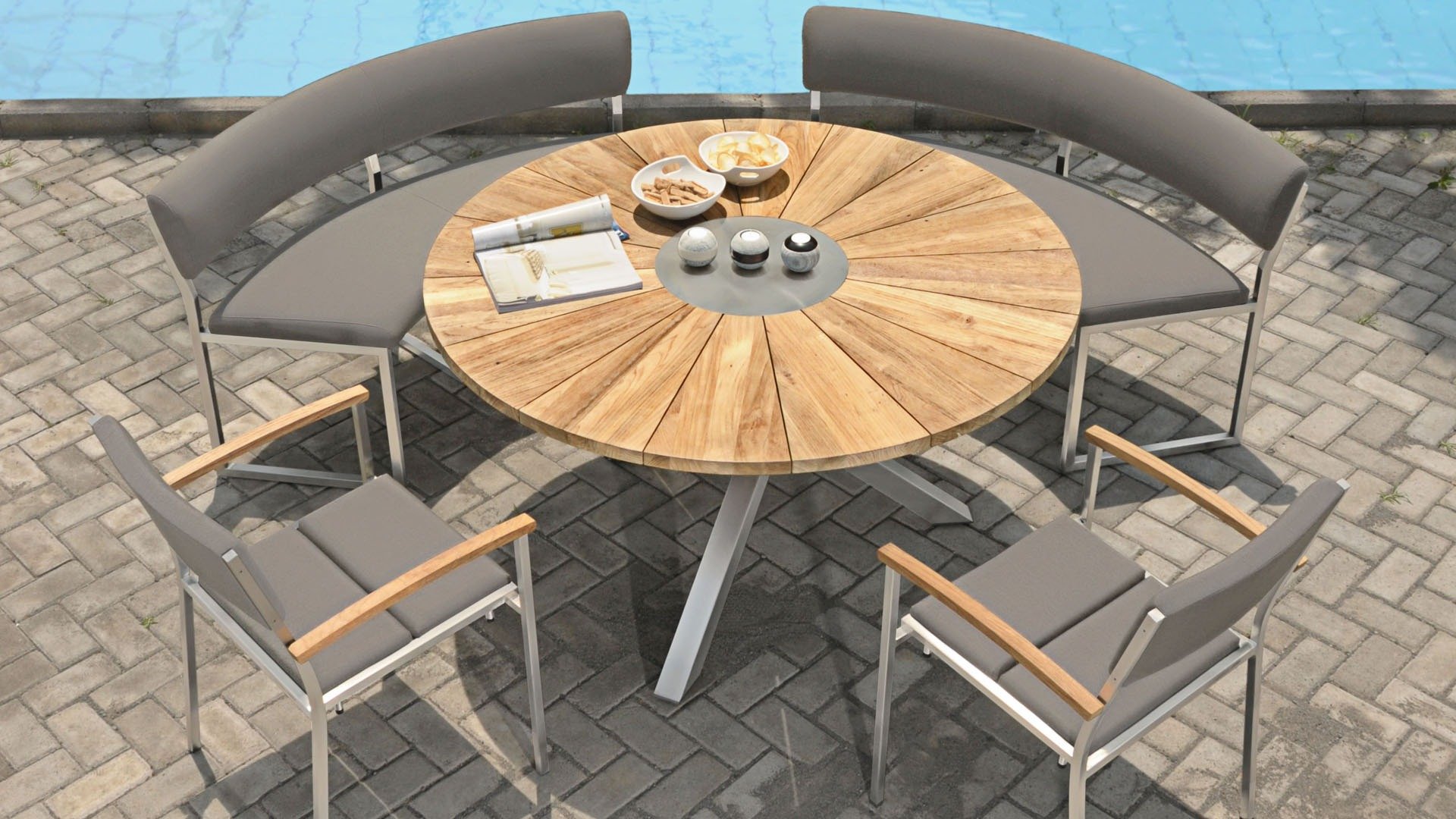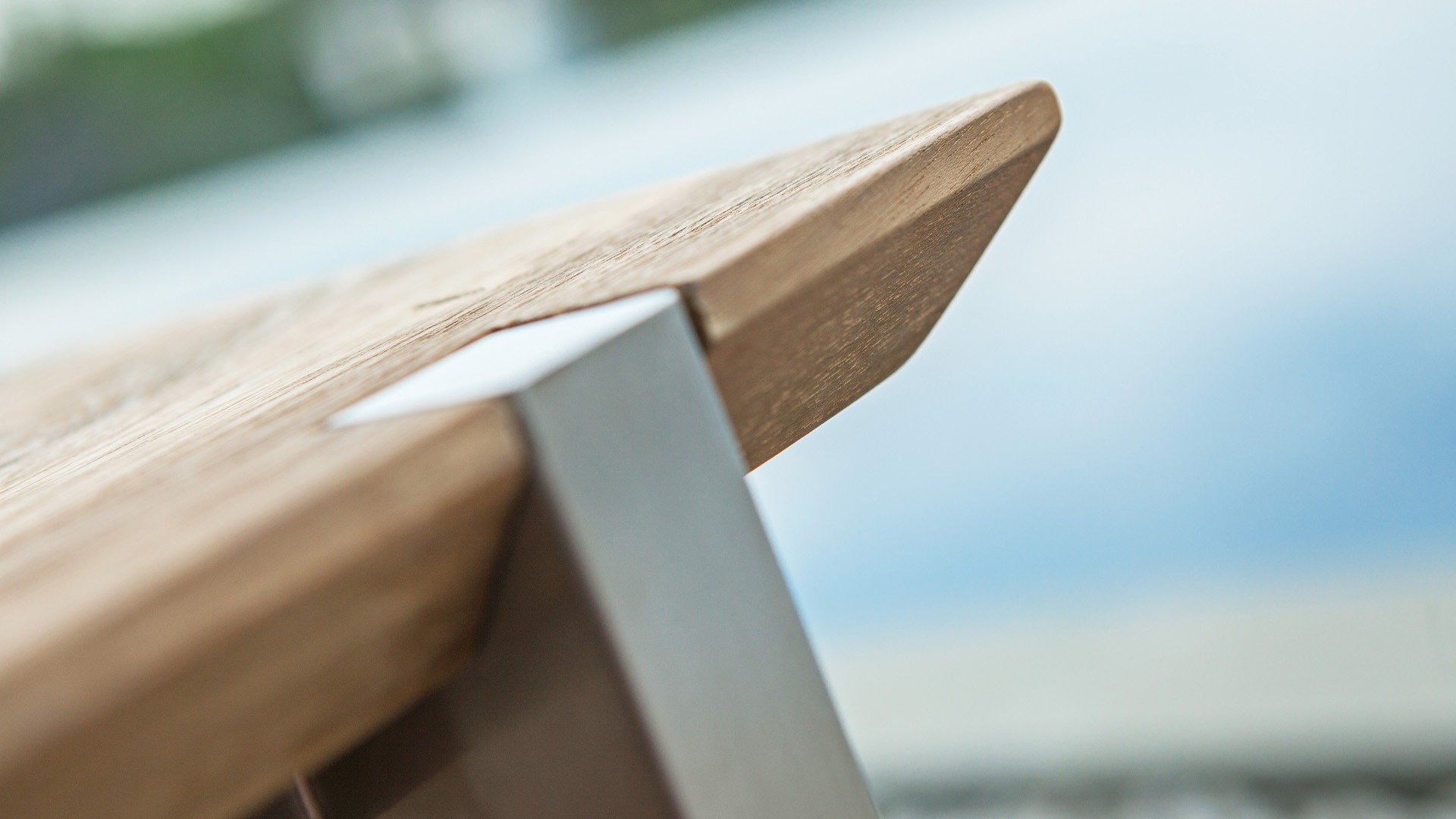 Die Zebra Greenlineserie Quadux verwendet hochwertige Materialien, welche unter anderem aus recycelten Teakhölzern besteht. Das recycelte Teak wird aus alten Booten, Schiffen, Brücken oder Häusern gewonnen und anschließend aufwendig selektiert, gereinigt und gebürstet. Jedes einzelne Teil ist ein Unikat mit einer Geschichte, Astlöcher, Nagel- und Bohrlocher, Rillen und Gebrauchsspuren drücken den besonderen Charme aus. Quadux zeichnet sich vor allem durch sein einzigartiges Design, eine moderne Formensprache und den lebhaften Kontrast von kühlem Edelstahl und warm anmutendem recycelten Teakholz aus. Die quadratische Tischplatte aus recyceltem Teakholz besitzt eine leicht abgeschrägte Kante, wodurch der Tisch elegant wirkt. Optisch durchbricht eine in die Mitte eingelassene Edelstahlplatte die Tischoberfläche und setzt damit die moderne Formensprache des Tisches fort. Die Edelstahlplatte ist herausnehmbar und kann durch einen zusätzlich erhältlichen Sektkühler und Flaschenhalter ersetzt werden. Das U-förmige Gestell aus hochwertigem Edelstahl greift das Inlay der Tischplatte gekonnt auf, verleiht dem Tisch Stabilität und bietet besonders viel Beinfreiheit. Mit einer Seitenlänge von je 1,40 Metern bietet der Tisch Raum für bis zu acht Personen.