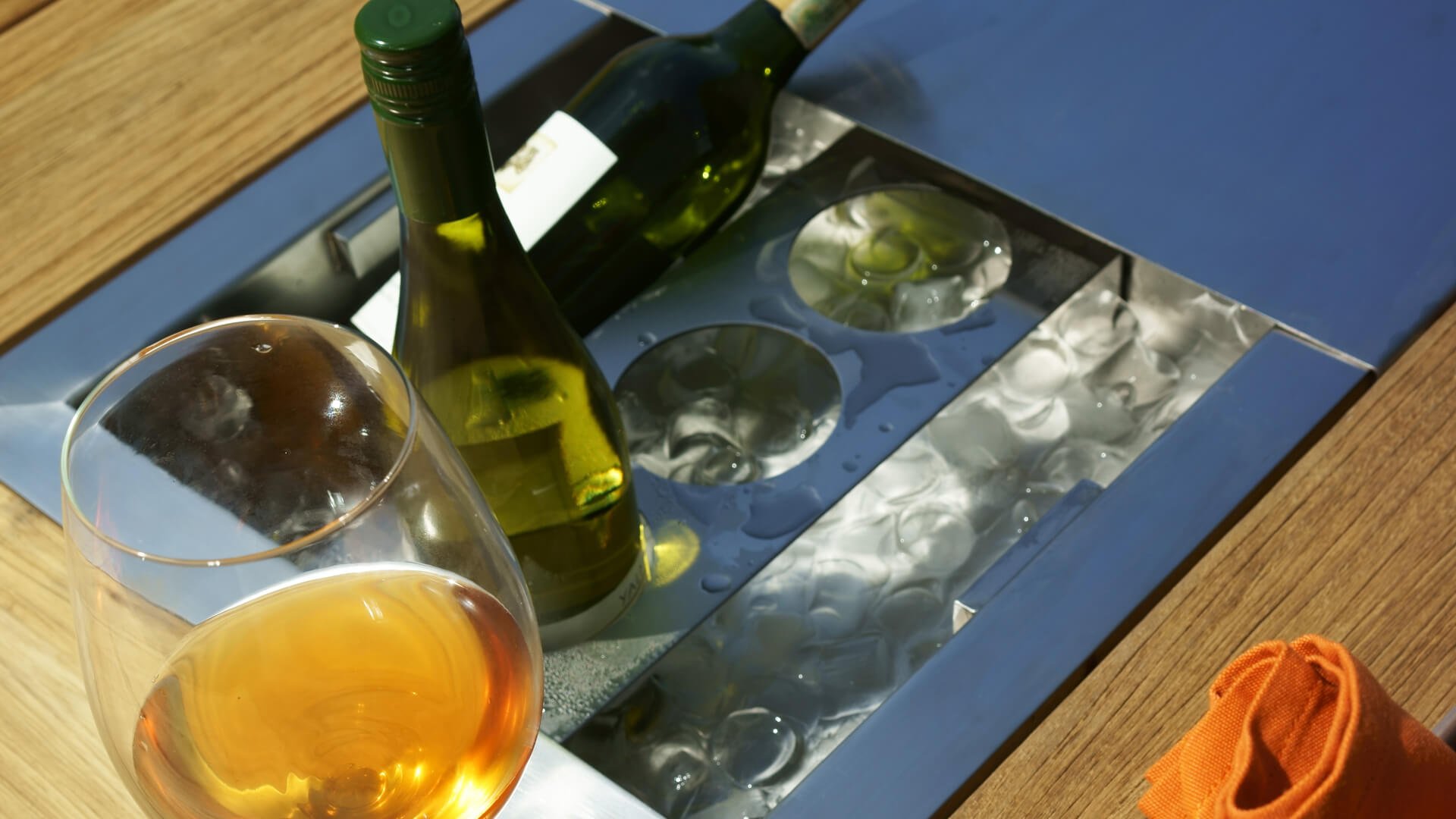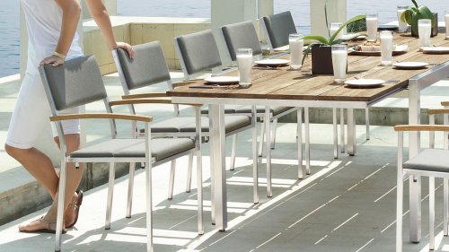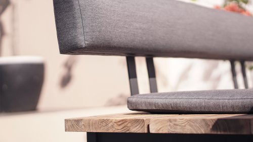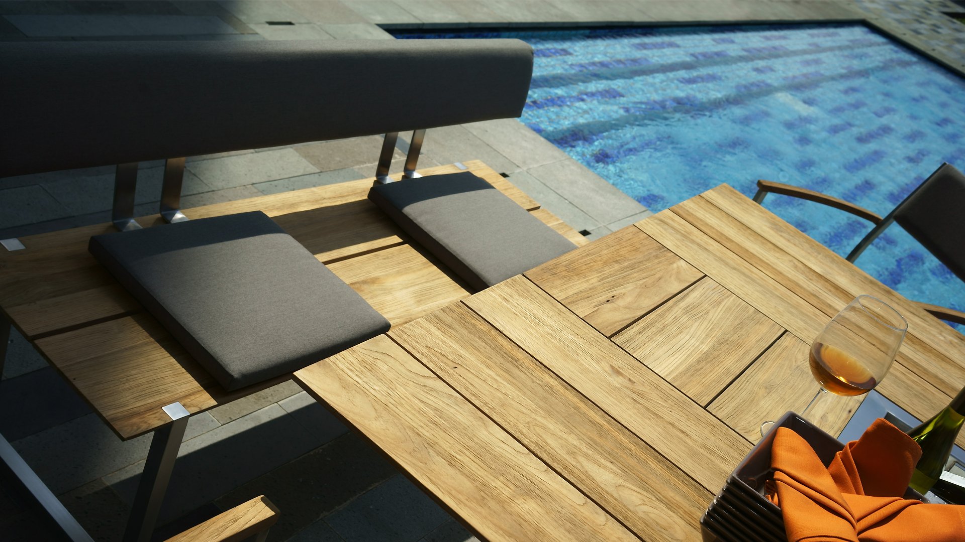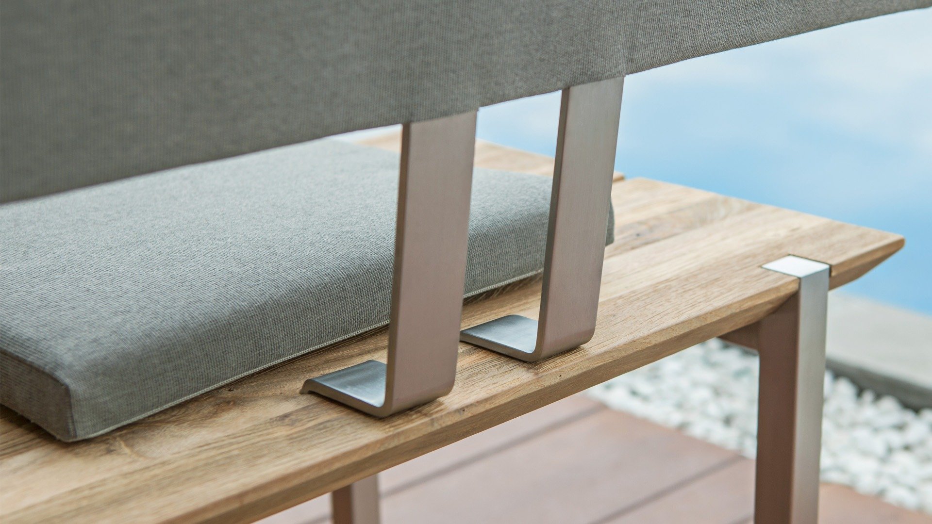 Die Zebra Greenlineserie Quadux verwendet hochwertige Materialien, welche unter anderem aus recycelten Teakhölzern besteht. Das recycelte Teak wird aus alten Booten, Schiffen, Brücken oder Häusern gewonnen und anschließend aufwendig selektiert, gereinigt und gebürstet. Jedes einzelne Teil ist ein Unikat mit einer Geschichte, Astlöcher, Nagel- und Bohrlocher, Rillen und Gebrauchsspuren drücken den besonderen Charme aus. Quadux zeichnet sich vor allem durch sein einzigartiges Design, eine moderne Formensprache und den lebhaften Kontrast von kühlem Edelstahl und warm anmutendem recycelten Teakholz aus. Die quadratische Tischplatte aus recyceltem Teakholz besitzt eine leicht abgeschrägte Kante, wodurch der Tisch elegant wirkt. Optisch durchbricht eine in die Mitte eingelassene Edelstahlplatte die Tischoberfläche und setzt damit die moderne Formensprache des Tisches fort. Die Edelstahlplatte ist herausnehmbar und kann durch einen zusätzlich erhältlichen Sektkühler und Flaschenhalter ersetzt werden. Das U-förmige Gestell aus hochwertigem Edelstahl greift das Inlay der Tischplatte gekonnt auf, verleiht dem Tisch Stabilität und bietet besonders viel Beinfreiheit. Mit einer Seitenlänge von je 1,40 Metern bietet der Tisch Raum für bis zu acht Personen.