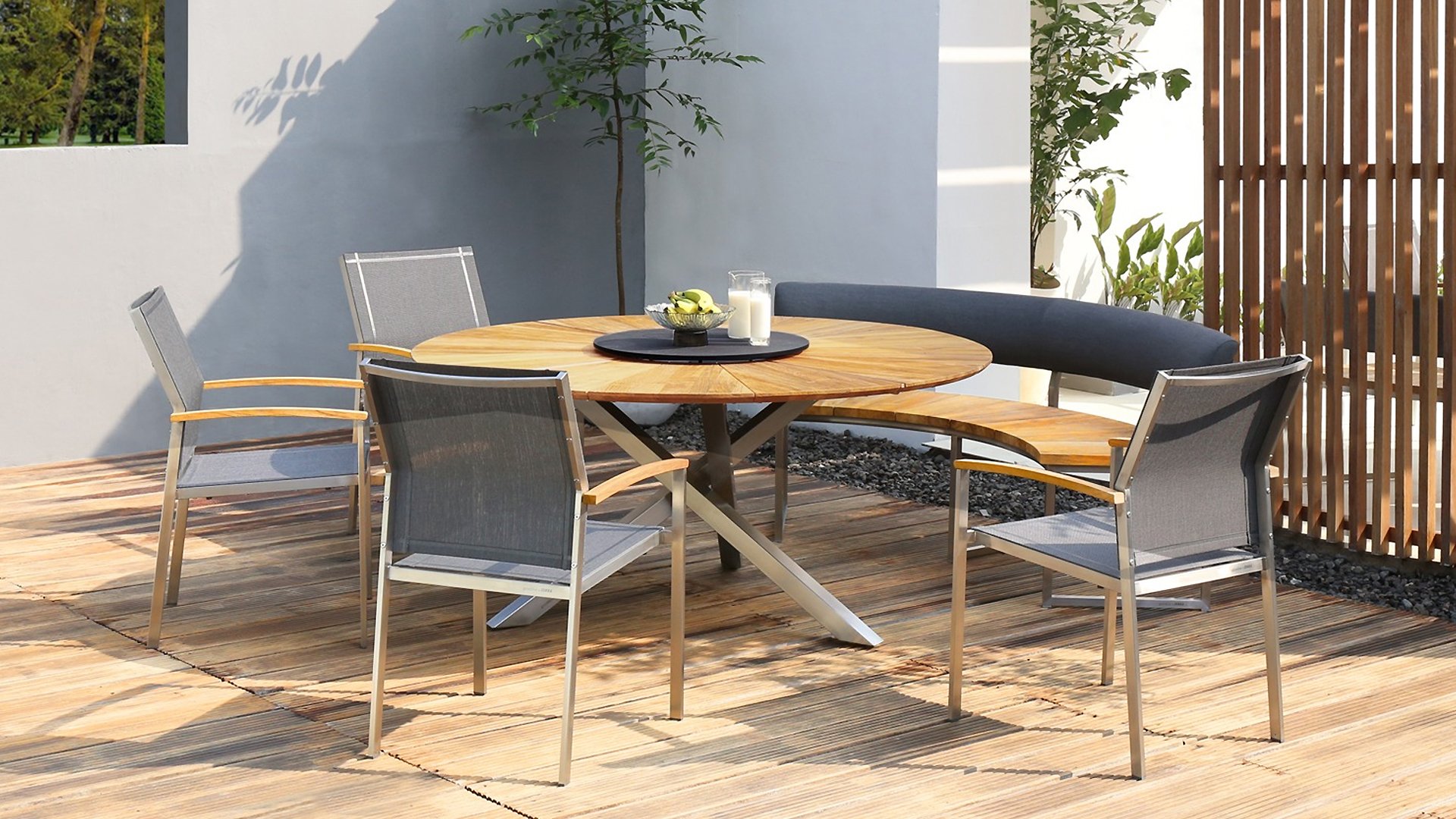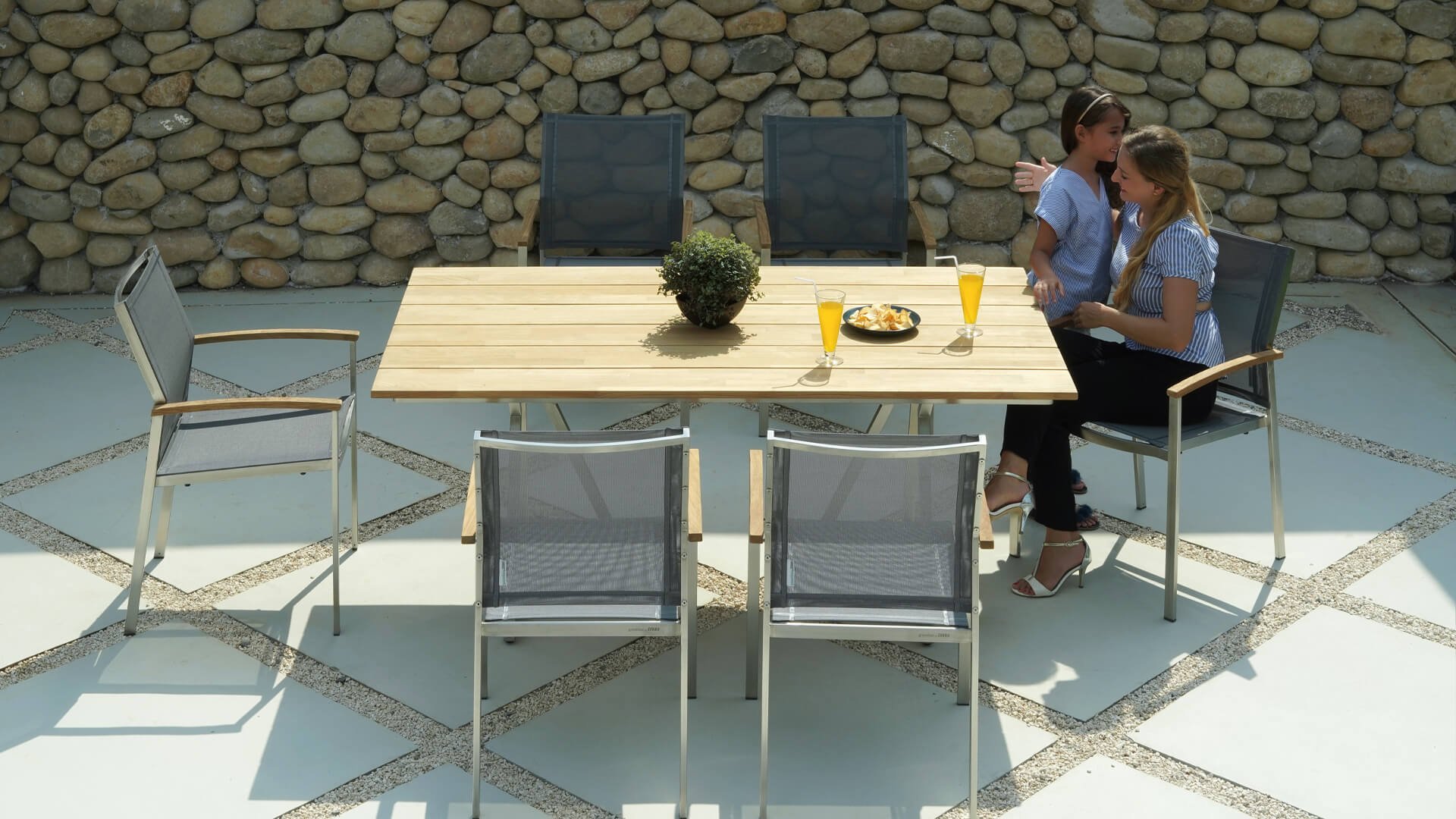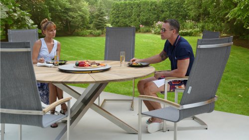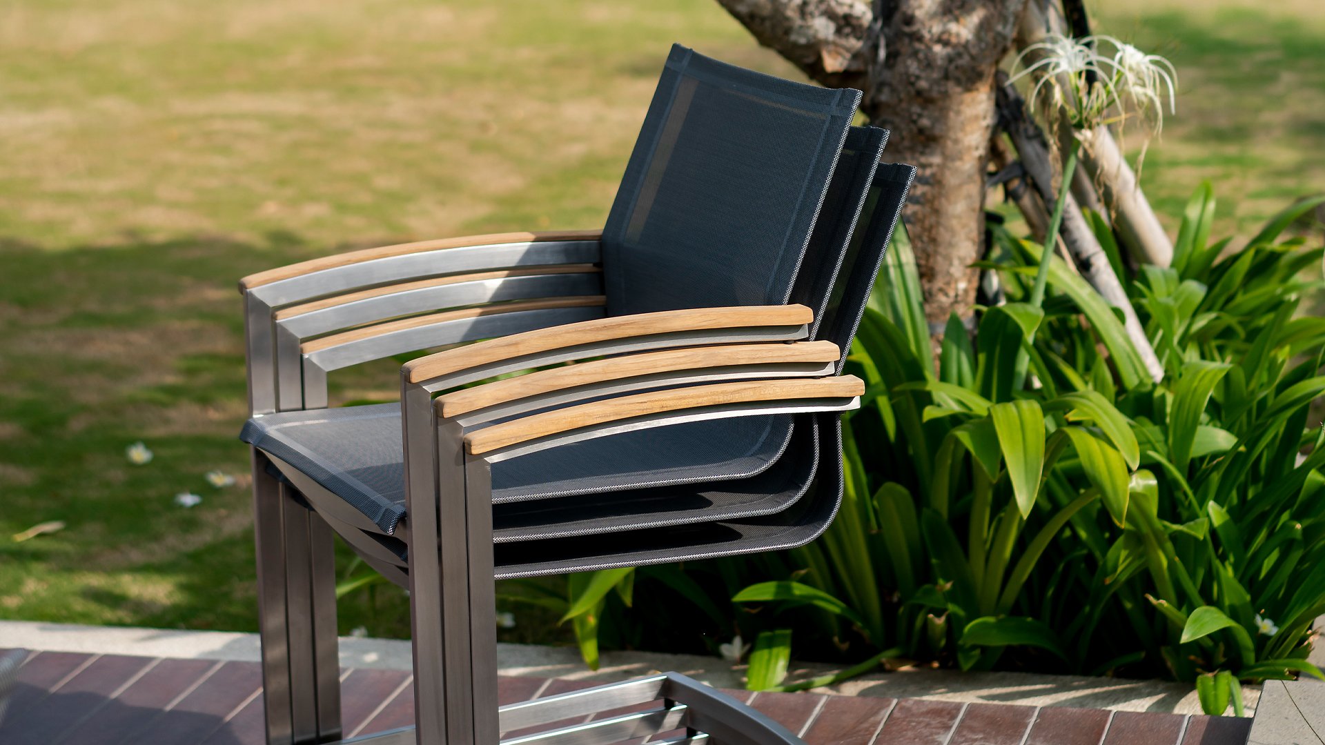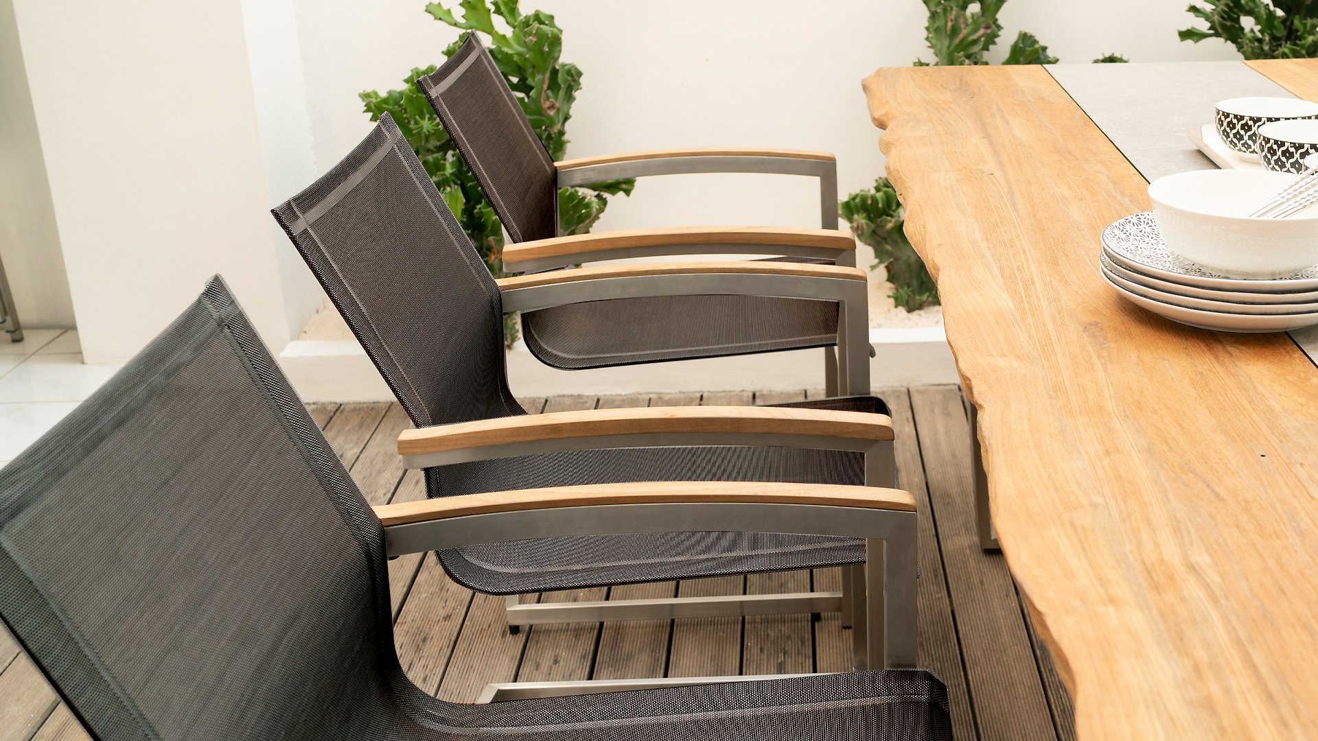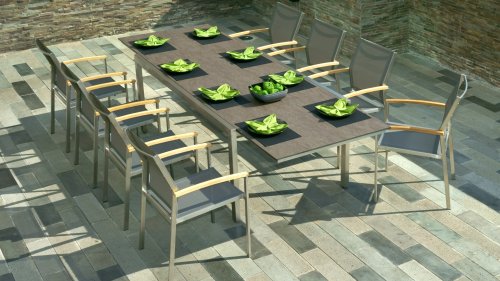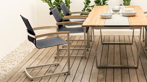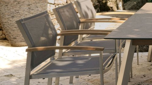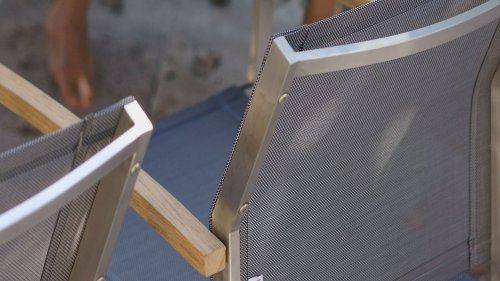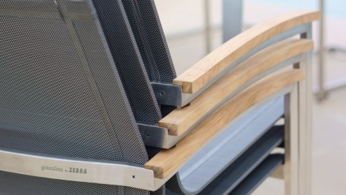 Der Stapelstuhl Setax besteht aus einem hochwertigen, gebürsteten Edelstahlgestell und einer erstklassigen Bespannung aus Batyline®-Textilgewebe in anthrazit. Es gibt in dieser Serie 2 Rücklehnhöhe. Die Armlehnen sind aus exclusivem Teakholz gefertigt und sorgen für eine angenehme Haptik. Der Stapelsessel Zebra Setax lässt sich wunderbar mit den anderen Möbel-Stücken der Serie Setax von Zebra kombinieren und harmoniert hervorragend mit Tischen, die über ein Edelstahlgestell verfügen, wie beispielsweise dem Gartentisch Naxos von Zebra.